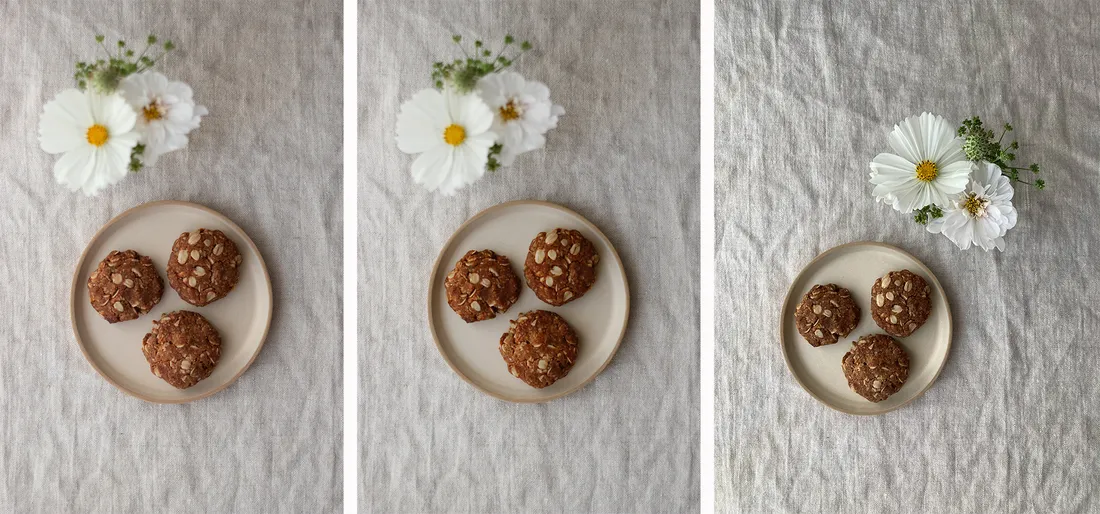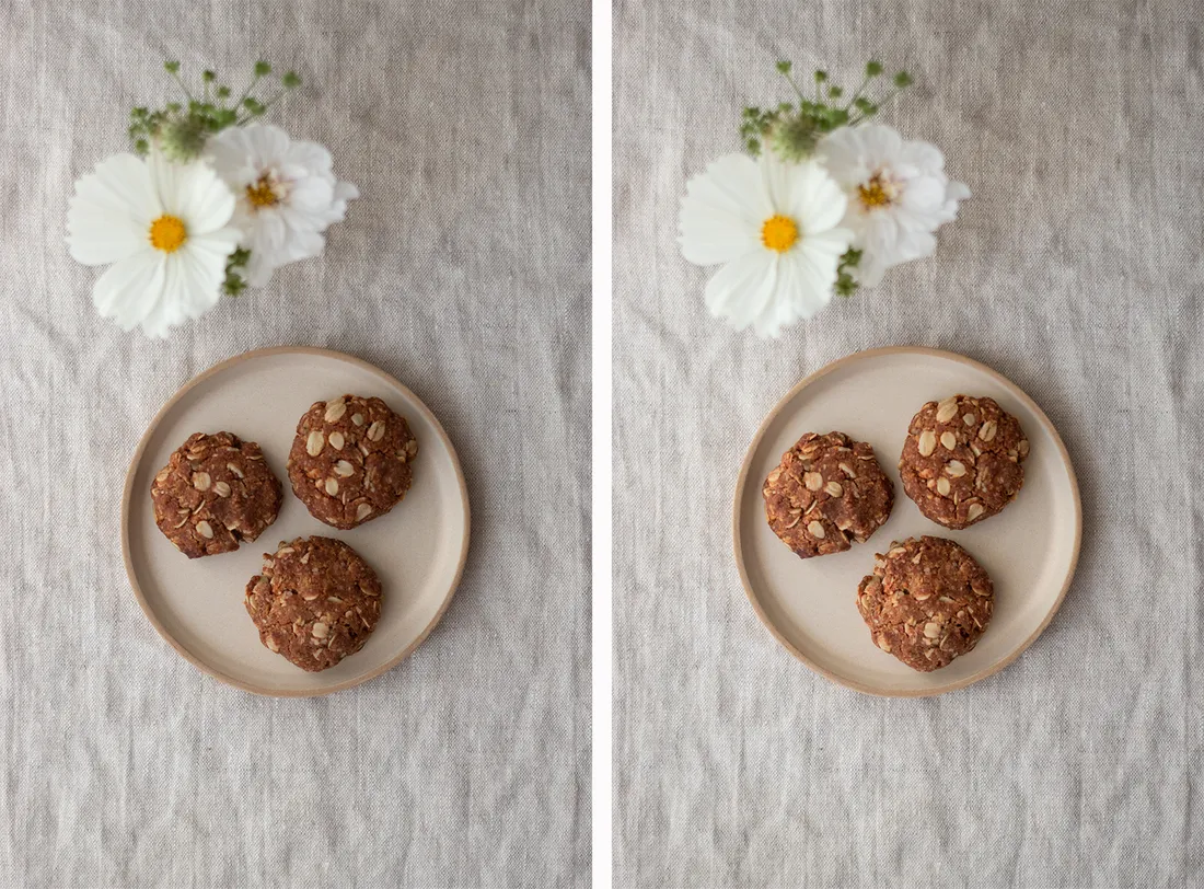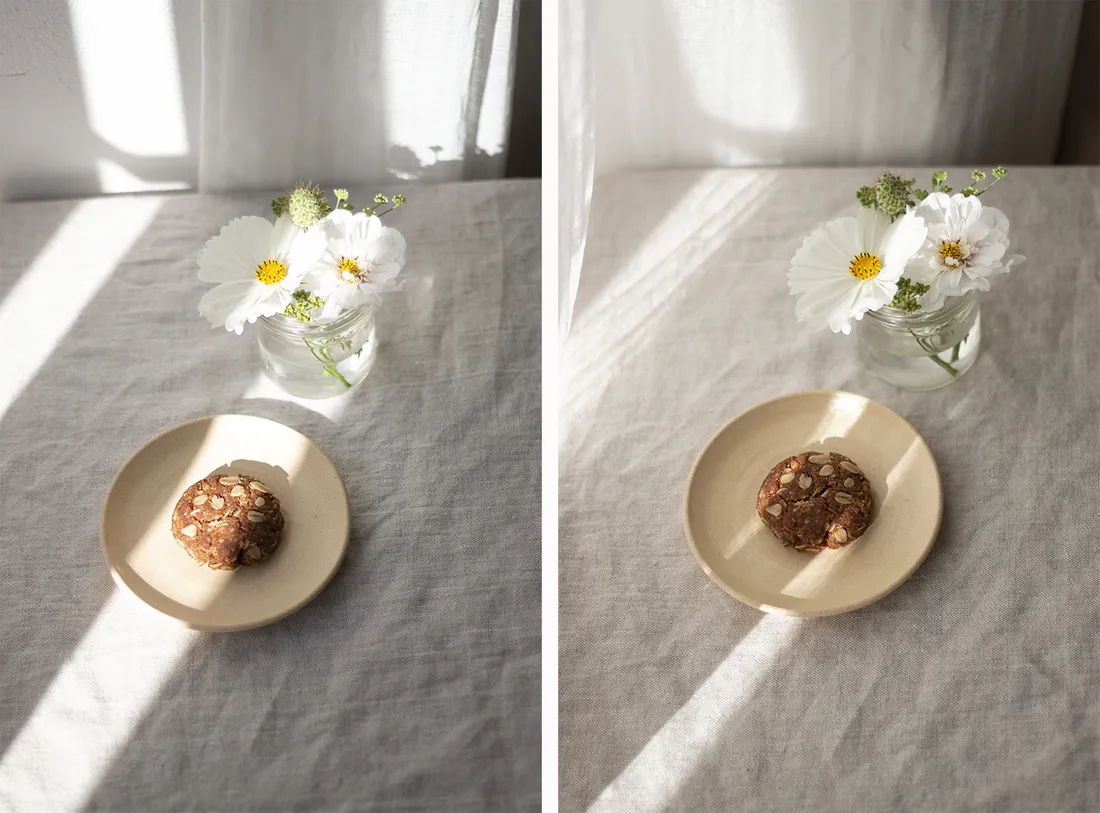 A tady je konkrétní příklad. Obě fotky jsem fotila v září, v průběhu dopoledne u balkonového okna, které je orientované na severovýchod. Ani jedna z fotek není upravená. Zatímco na fotce vlevo na sušenku dopadá přímé sluneční světlo a pohled na ni není nijak příjemný kvůli ostrým kontrastům, na fotce vpravo je tatáž scéna focená ve chvíli, kdy jsem okno zatáhla jemnou záclonou. Světlo stále dopadá na sušenku, ale jeho síla je zmírněná tenkou látkou a fotka je tak o poznání lepší, barvy přirozenější. Fotka bude potřebovat jemnou úpravu, ve které ještě zjemním stíny, ale už teď můžete vidět, že stíny nejsou tak výrazné a barvy jsou příjemnější. Je to fotka, o které si řeknu, že je povedená.