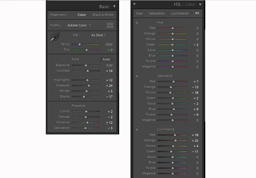 - Hotovou fotku otevřete v Lightroomu a použijte na ni nastavení presetu, o kterém jsem psala o kousek výš. Je pravděpodobné, že budete potřebovat udělat více úprav, záleží na světelných podmínkách, fotoaparátu a na tom, jaká úprava se vám líbí.