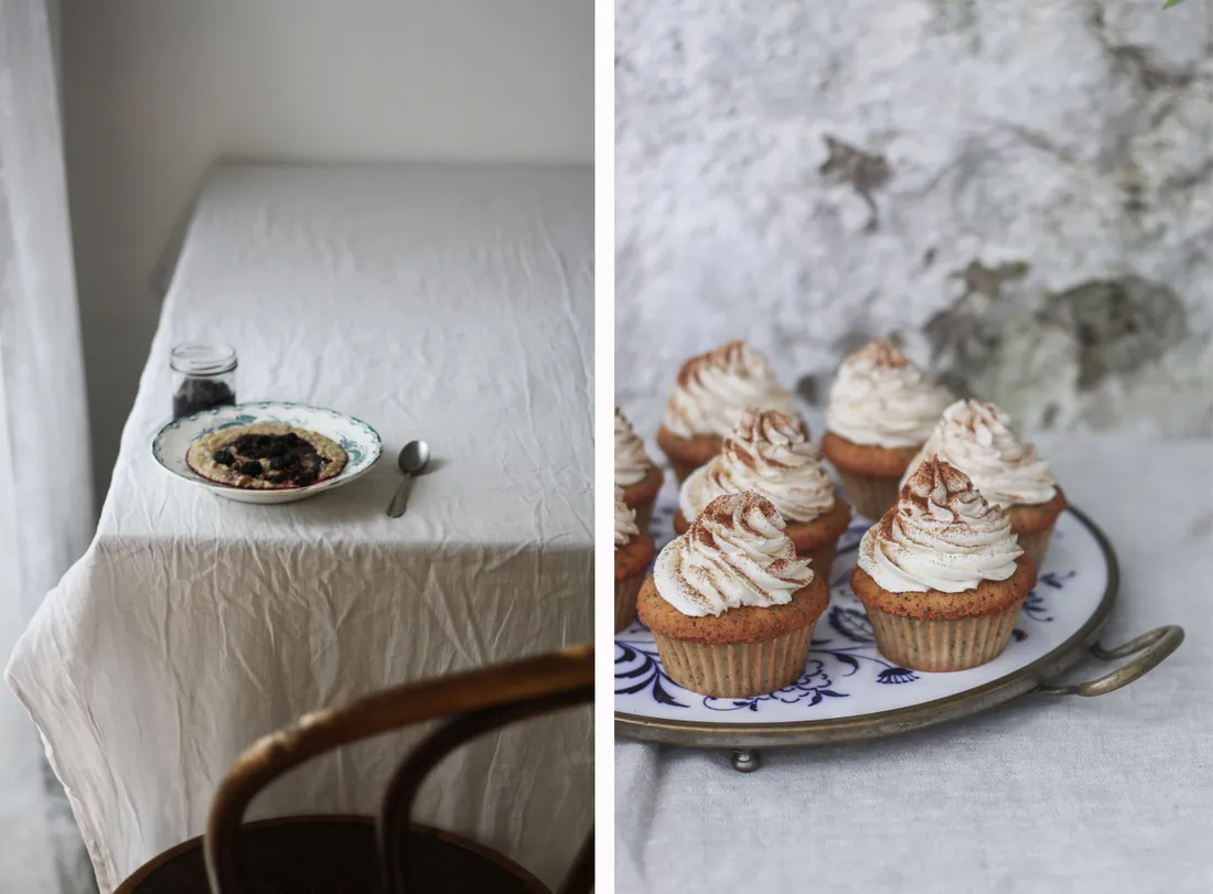 Jaké nádobí použít? Mám ráda staré kousky po babičce či z antiků. A také nádobí od malých českých tvůrců. Společné mají to, že jde převážně o kousky s matnou nebo polomatnou a světlou glazurou. V lesklé a hladké glazuře se odráží světlo a někdy může jít vidět i váš odraz.