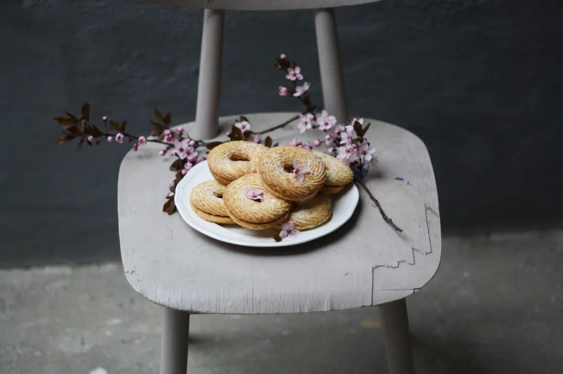 V praxi to vypadá tak, že si k oknu přisunu malý stolek, dám na něj lněný ubrus, focené jídlo (v tomto případě sušenky) a vázičku s květinami, která barevně doplňuje celu fotku. Do pozadí někdy rozházím pár lístků nebo květů a jdu fotit. Zkouším, jak scéna vypadá přes objektiv, posouvám vázičku a talíř, dokud nejsem spokojená.