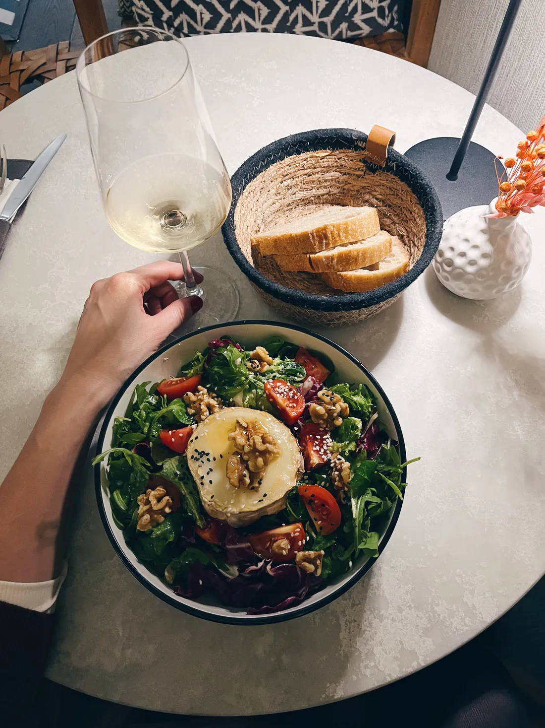 Vybrala jsem si salát s kozím sýrem, medem, vlašáky a skleničku vína. Skvělé to bylo, zas bych se vrátila.