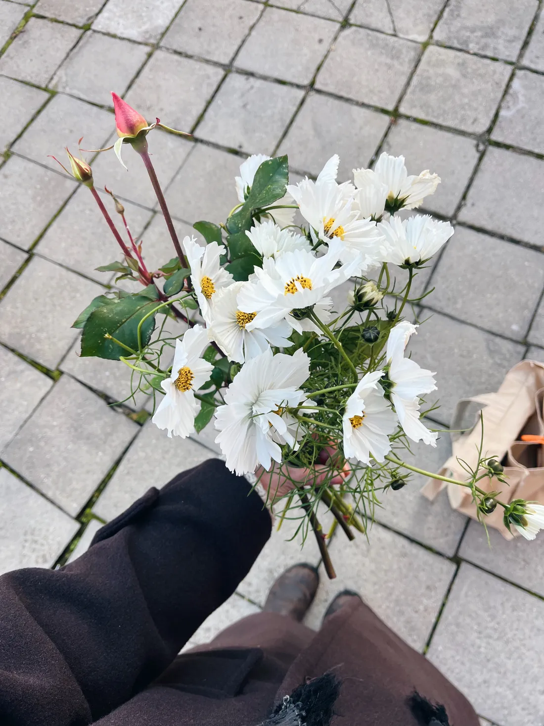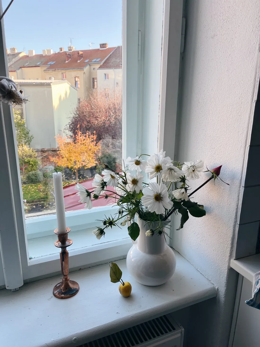 Na zahradě jsem si natrhala poslední letošní kytici do vázy - krásenky a poupátka růží. Zrovna dnes mi jedna z růží vykvetla.