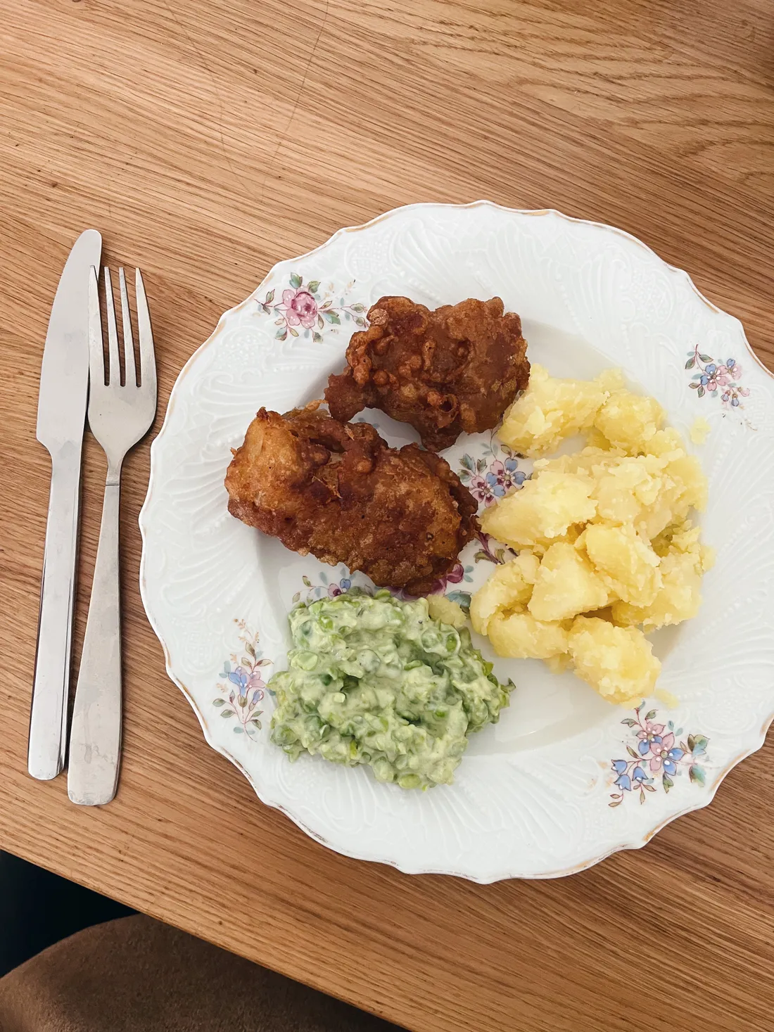 Další den byla neděle a můj muž vařil oběd - skoro fish and chips, jen místo hranolek jsme měli brambory. A ještě mačkaný hrášek s mátou. Skvělé to bylo.