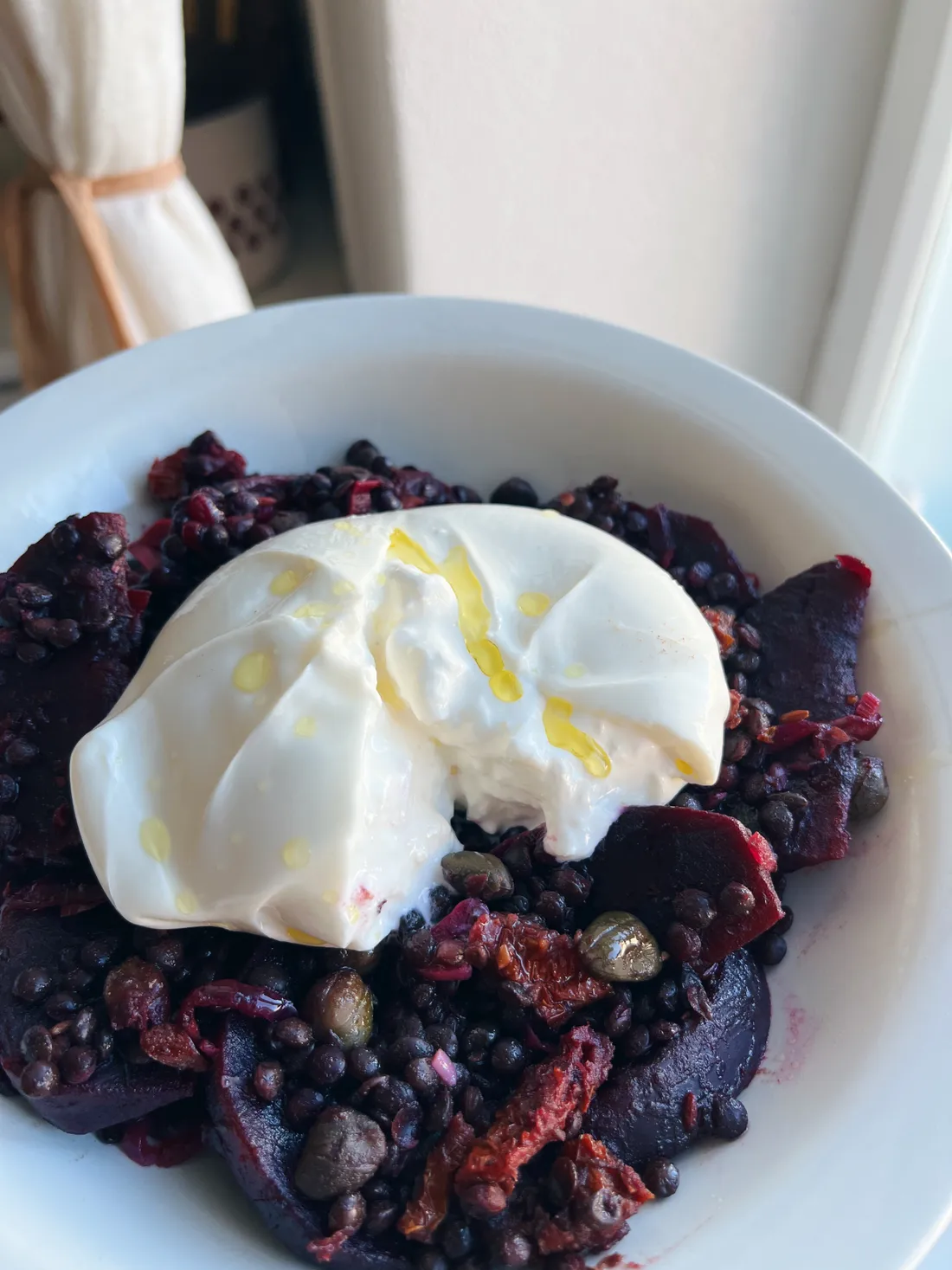 Uvařila jsem černou čočku, v jiném hrnci jsem uvařila řepu a nakrájela ji na klínky. Oboje jsem smíchala a přidala spoustu dalších věcí: dresink jako na salát (olivový olej, jablečný ocet, sůl, pepř), několik sušených rajčat nakrájených na kousky a hrst kaparů. A nakonec jsem v pánvi pomaloučku opékala červenou cibuli a plátky česneku. Všechno jsem promíchala, nechala vychladit a servírovala s burratou. Mňam!