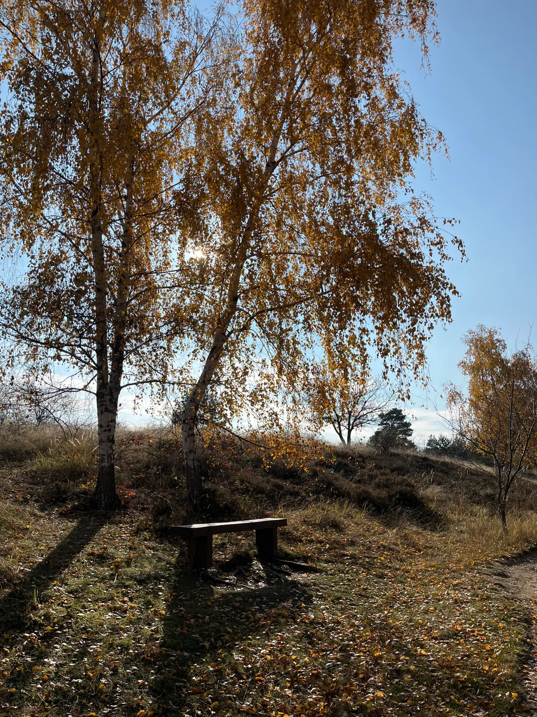 Břízy mají zlaté lístky, všude kolem keře šípků, vřes, opravdu krásný kus krajiny.