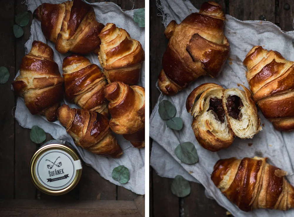 Křehoučké a křupavé croissanty plněné máslem z lískových oříšků a čokolády od Šufánka, které se pod rukama jen rozpadají. To je moje verze croissantů, které jsou navíc oproti těm pravým francouzským (jejichž příprava může zabrat více než čtyřiadvacet hodin) hotové za dopoledne.