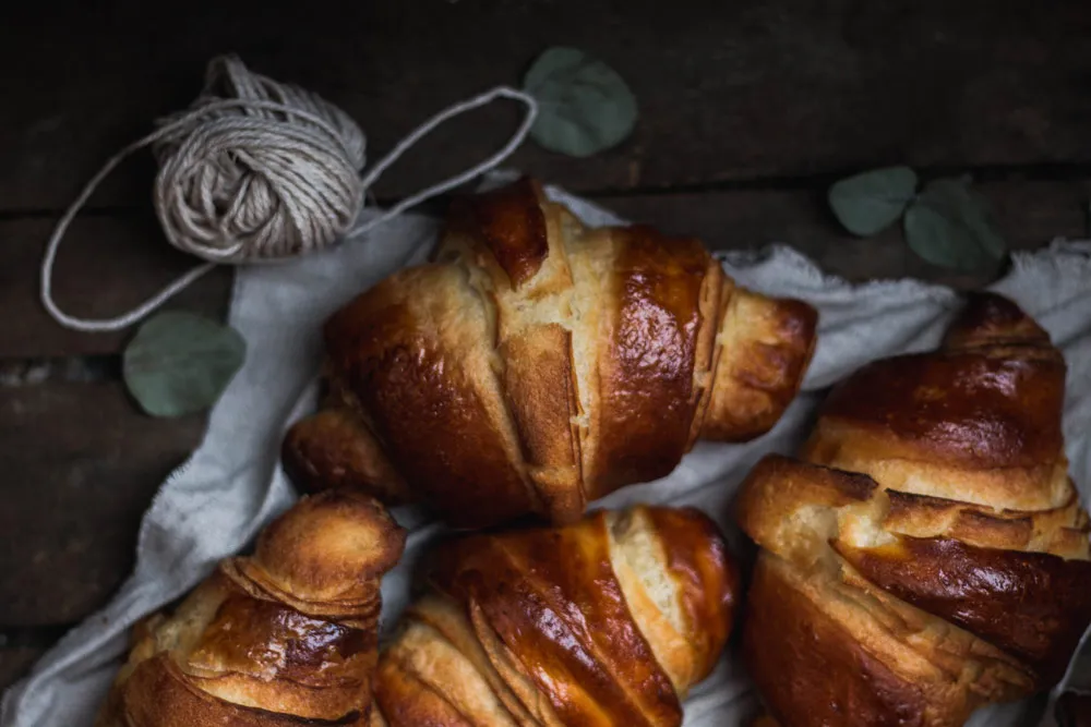 Těsto na croissanty (neboli plundrové těsto) se skládá ze dvou částí. Z vrstev másla a z kynutého těsta, které přes sebe navzájem překládáte, čímž docílíte takzvaného “listování”, tedy střídání tenoučkých vrstev másla a těsta. Voda obsažená v těstě se při pečení vypaří a vytvoří tradiční nadýchanou strukturu croissantu.