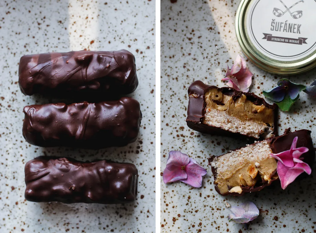 Poslední dobou mě pořád honí mlsná. Mám chuť na raw dobroty, na oříšky, na karamel... tak jsem to všechno spojila dohromady a vytvořila skvělou (téměř) raw verzi tyčinek Snickers. Jsou slazené jen troškou medu, sladkost zajišťují hlavně datle a při jejich pojídání vás vůbec nemusí trápit černé svědomí - jsou v nich totiž samé zdravé věci (ehm, až na tu čokoládu). Nejlepší část je raw karamel z datlí, arašídového másla Šufánek, kokosového krému a špetky soli, toho bych se mohla ujíst!