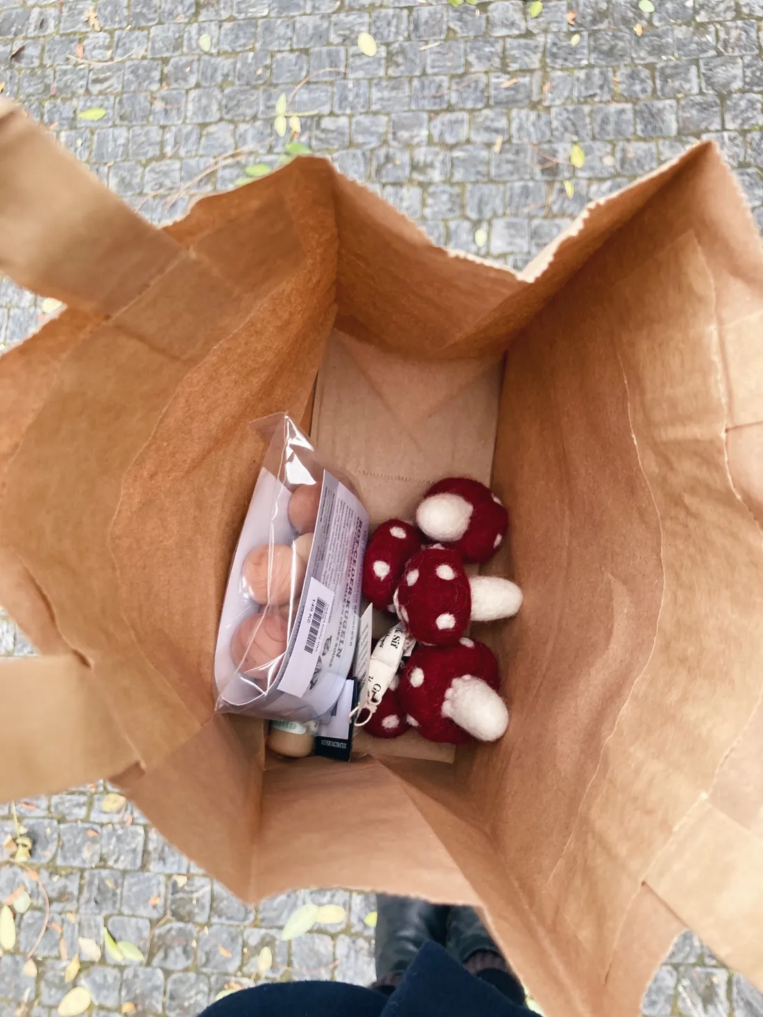 A co jsem koupila? Plstěné muchomůrky na stromeček (děti je budou milovat), cedrové kuličky do skříně proti molům a Havlíkův balzám na rty, na který nedám dopustit.