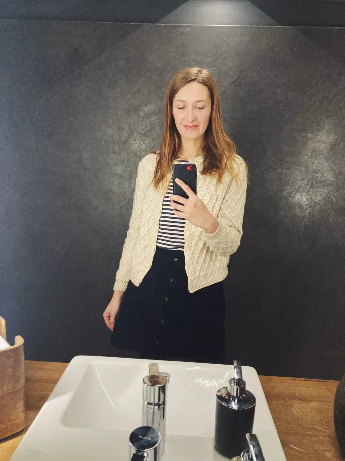 Já jsem na sobě měla svetřík, co jsem před dvěma týdny objevila v sekáči, pruhované tričko (koupila jsem je celé rodině v Army shopu, kdysi mi to poradil kamarád, jsou ušitá z vysokogramážní bavlny a můžu to potvrdil, nosím ho už roky). K tomu manšestrová minisukně a černé punčochy. Bylo mi v nich lehce chladno, a tak už se dívám po merino punčocháčích, vím, že je mají třeba v Reparádě.
