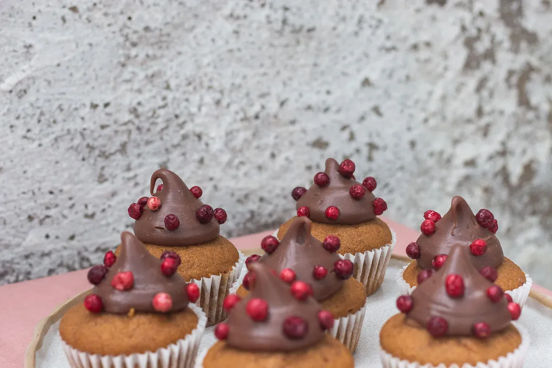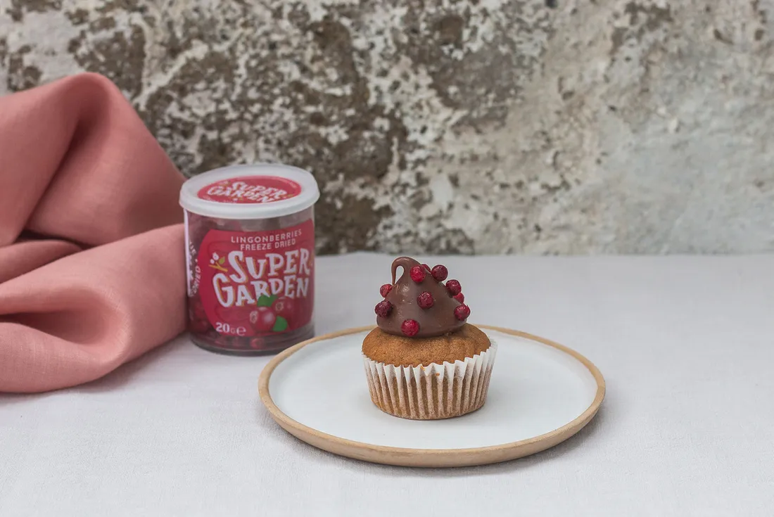 - Ztuhlý krém přemístěte do cukrářského sáčku s hladkou zdobicí špičkou (použila jsem špičku o průměru 18 mm) a všechny košíčky ozdobte velkou pusinkou z krému. Dozdobte lyofilizovanými brusinkami a můžete servírovat.