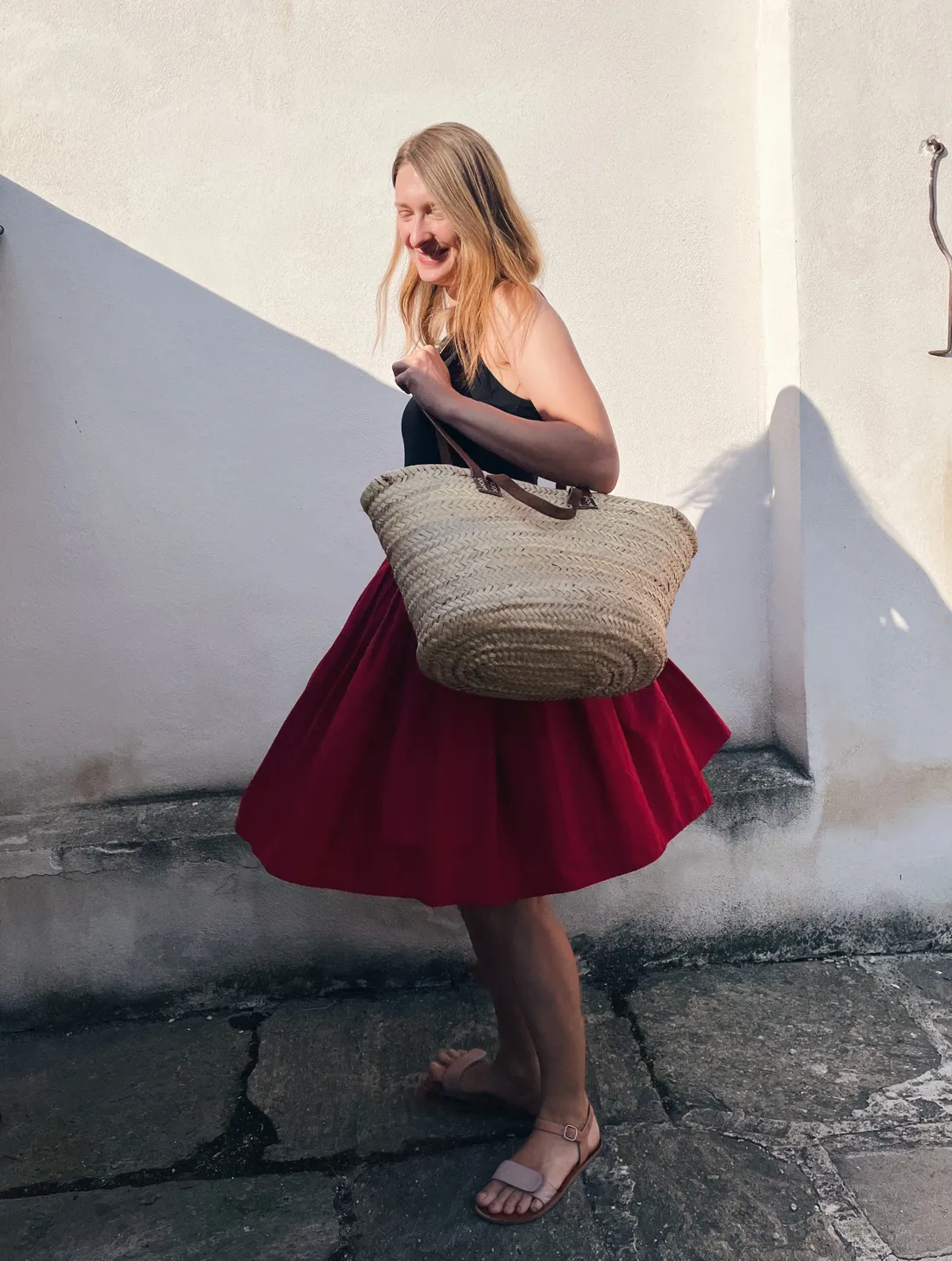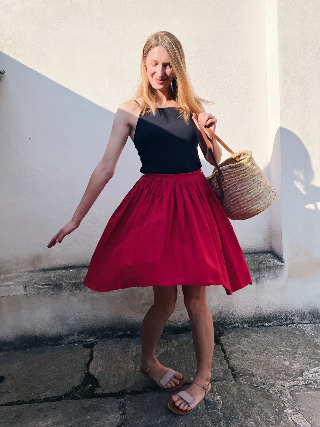 Ve čtvrtek byl další horký den. Ze skříně jsem vytáhla červenou sukni, ve které si přijdu jak maková panenka. Před možná 15 lety mi ji šila kamarádka ze staré látky po babičce. Trochu připomíná sukni od kroje, hezky drží tvar a jak se točí!