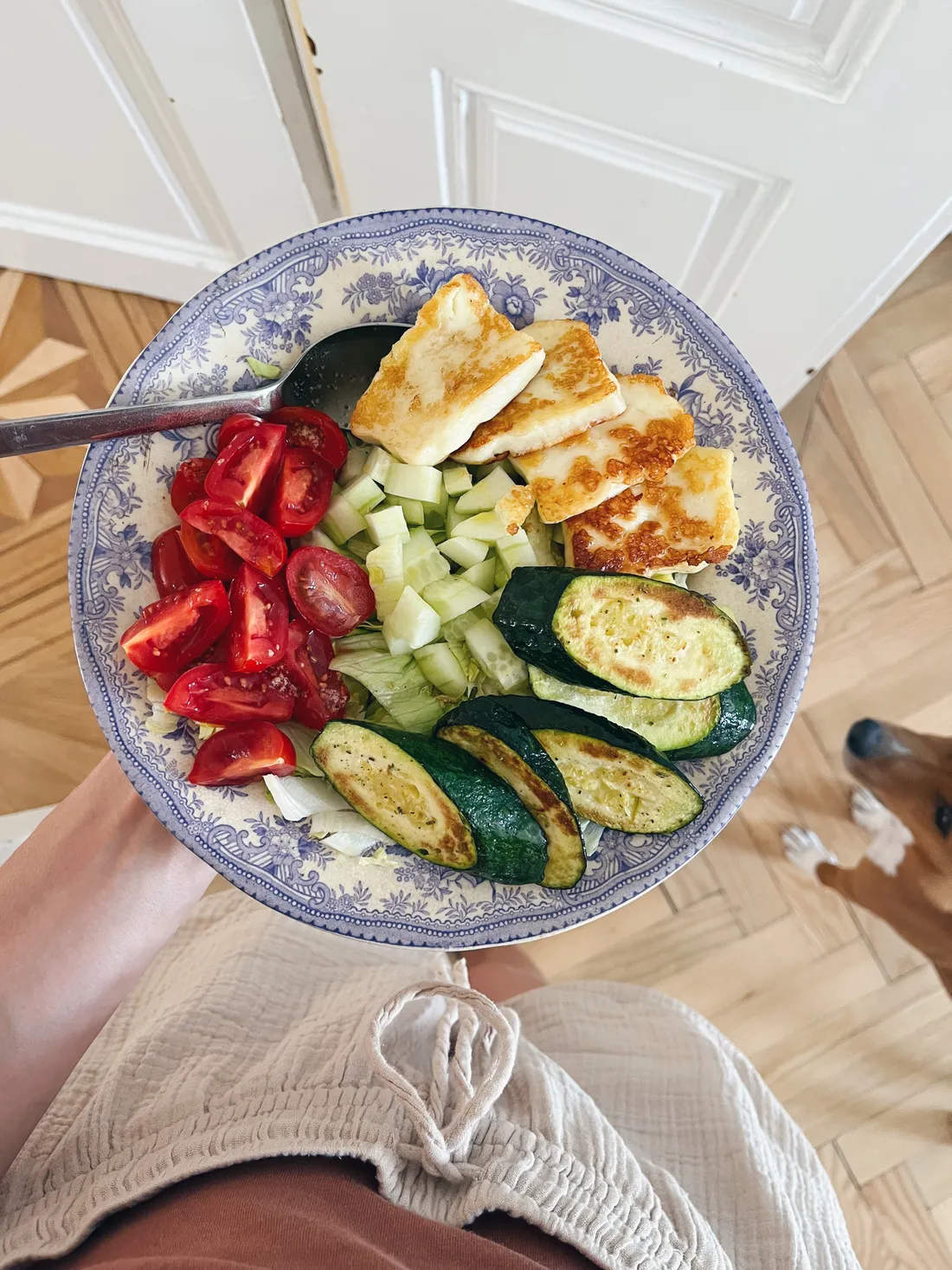K obědu jsem si nachystala salát plný zeleniny (ledový salát, okurka, rajčátka, cuketa opečená na ghí, halloumi a salátová zálivka).