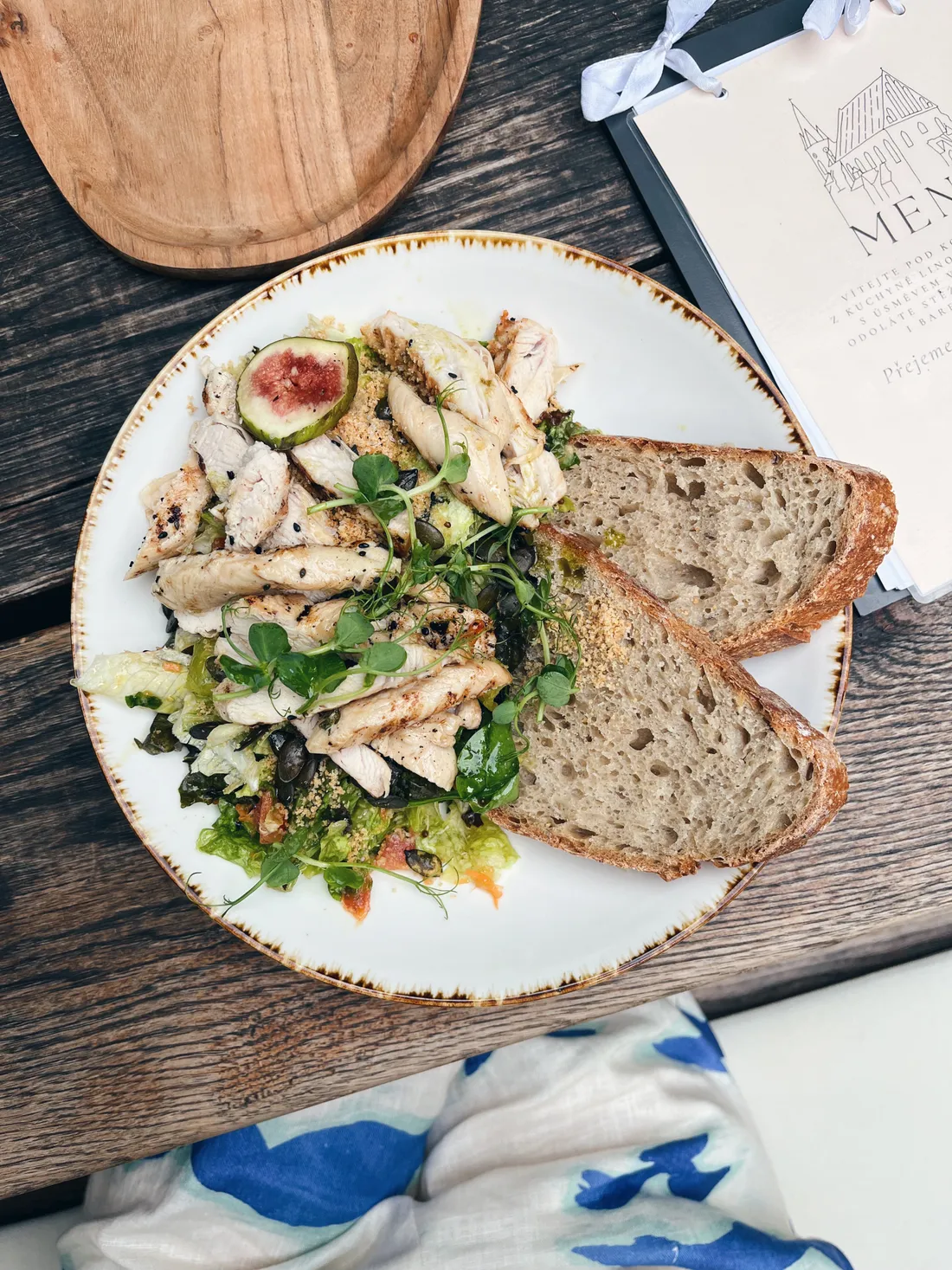 Usadily jsme se na jejich romantický dvoreček a daly si salát. Můj byl s kuřecím masem a medovo-hořčičnou zálivkou, mňam.