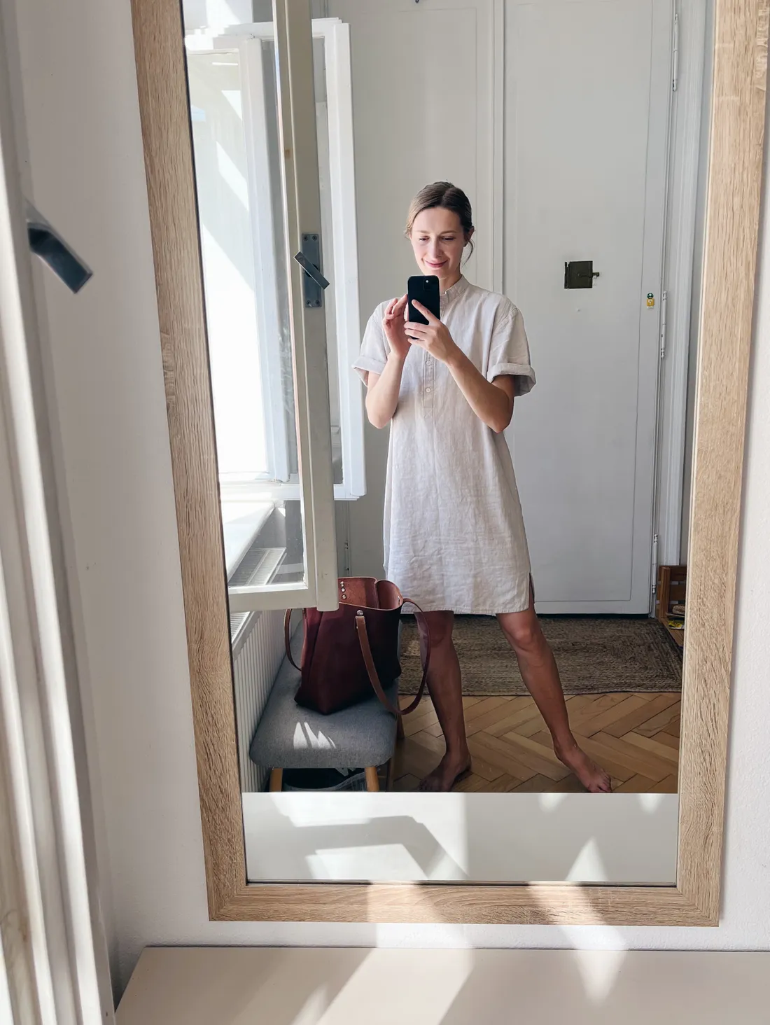 Ve středu mě čekala cesta na pracovní schůzku, tak jsem ze skříně vytáhla košilové lněné šaty z Venna.studio a k nim kabelku Eggo v odstínu kožíšku našeho Čotyho.