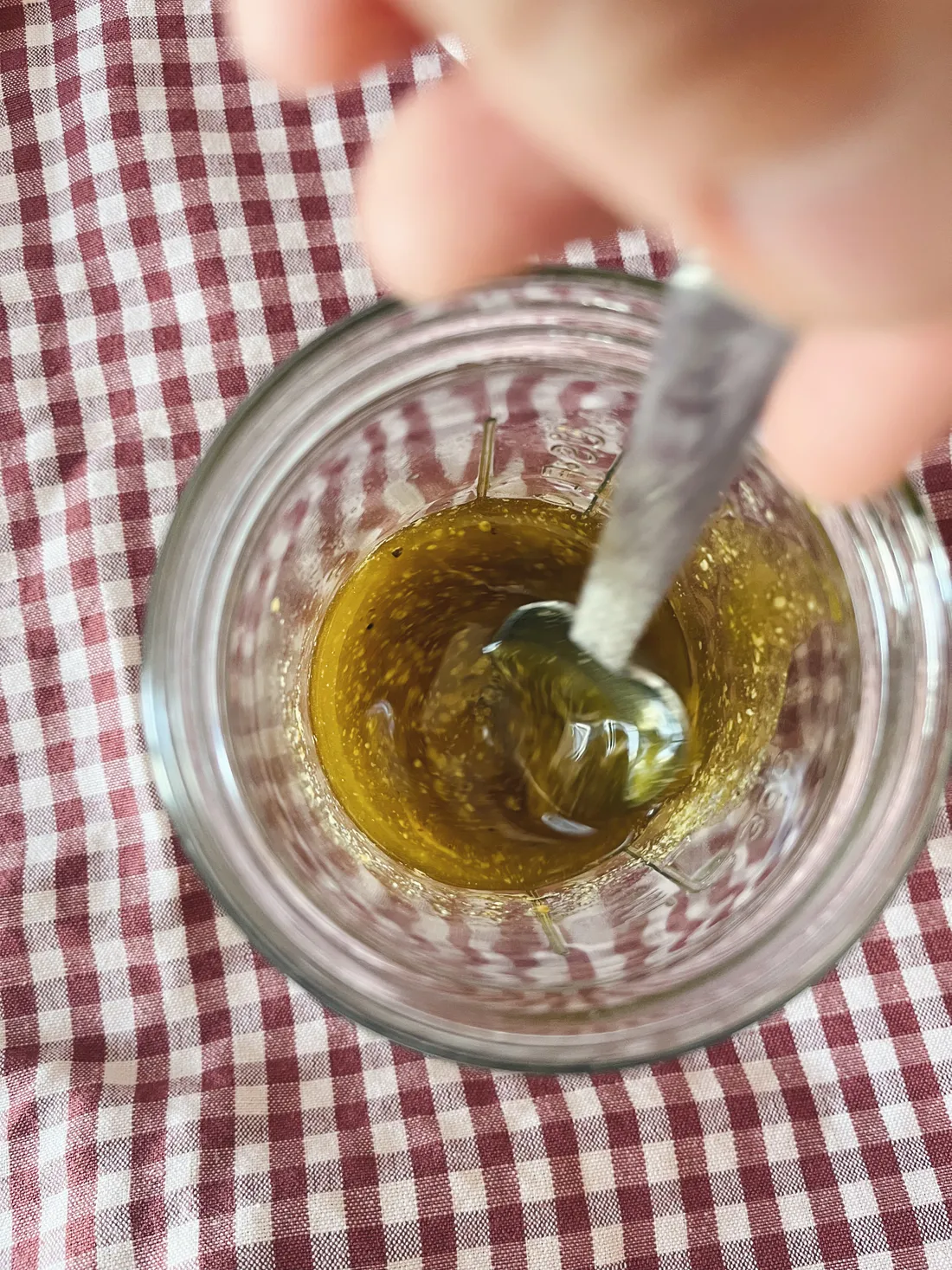 Namíchala jsem si do skleničky několikanásobnou dávku zálivky na salát. Jsou to 2 lžíce olivového oleje + 1 lžíce dýňového oleje + 1 lžíce jablečného octa + sůl, pepř + 1-2 lžičky lahůdkového droždí.