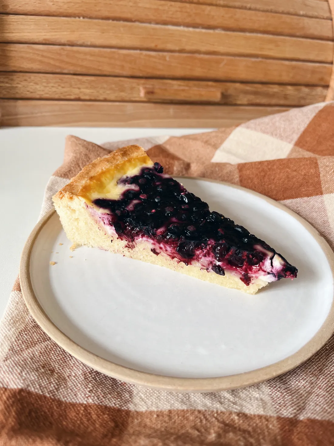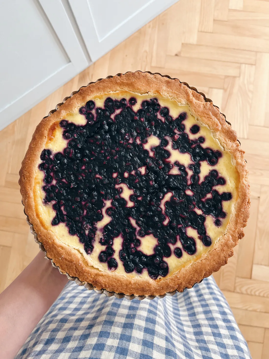 Tady je nakrojený. Křehké máslové těsto, náplň ze zakysané smetany a spousta borůvek, mňam.