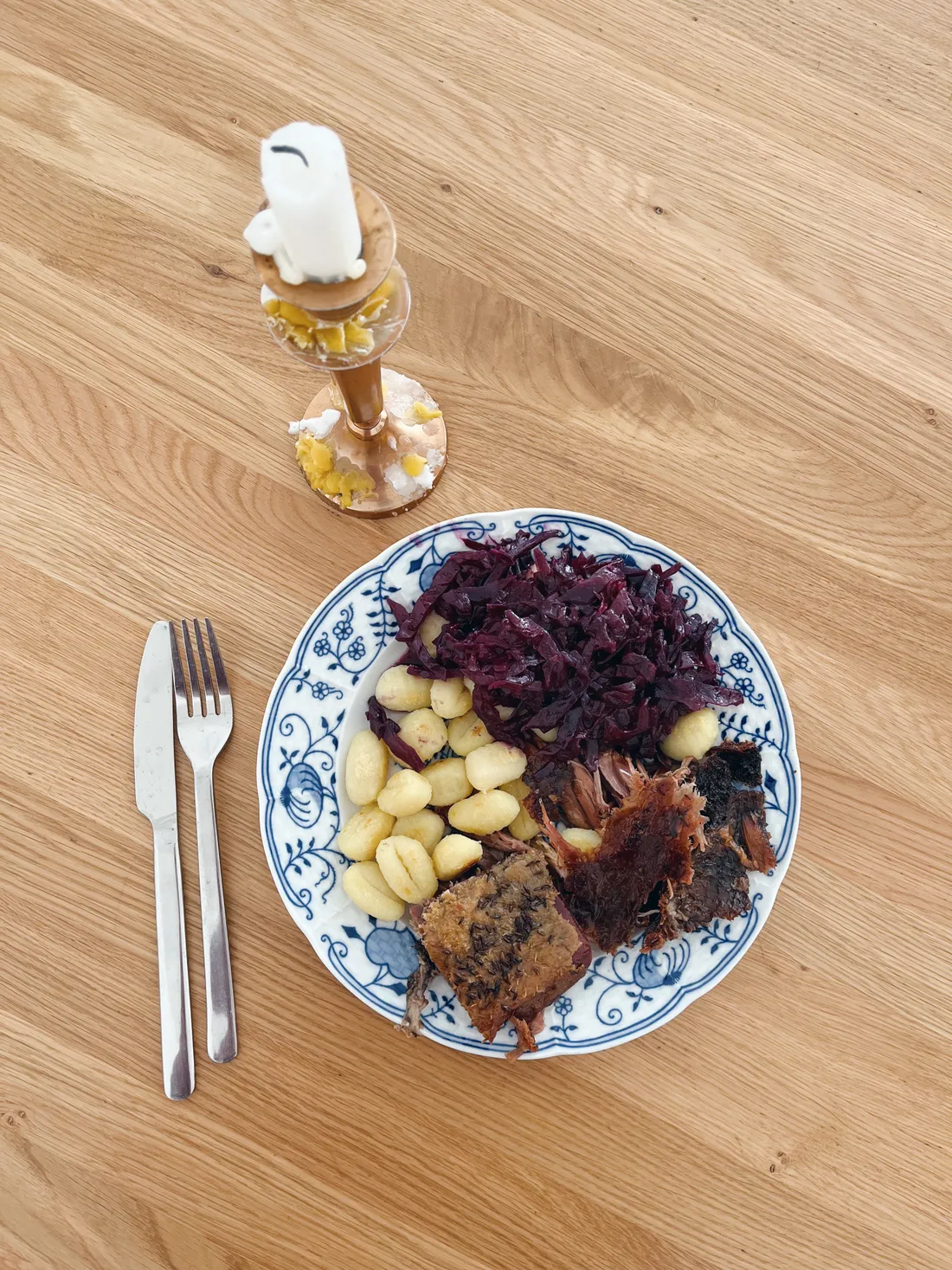 K obědu byla pečená kachna (tu si vzal na starosti manžel), já jsem uvařila zelí a opekla noky. Z kostí jsme pak uvařili vývar a sádlo nám zase zbylo na budoucí vaření.