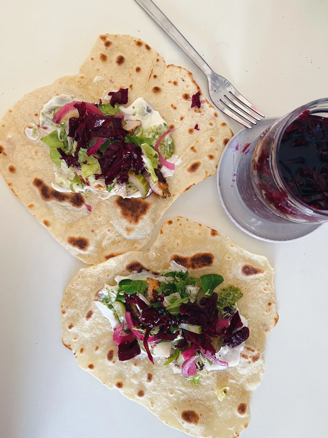 Uvnitř bylo petrželkové pesto, zakysaná smetana, opečené krůtí maso, salát, červená cibulka a kysané červené zelí. Celé jsem to stočila do wrapu a bylo to perfektní!