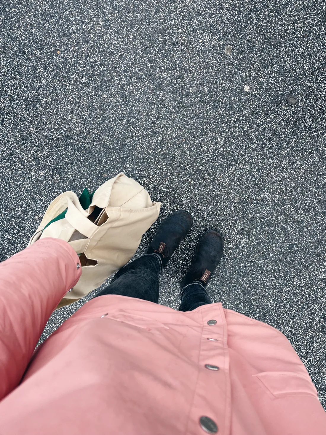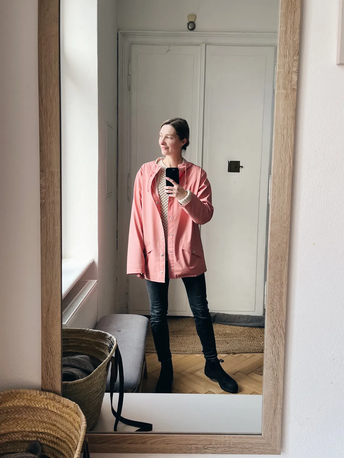 Pro mě teplý svetr, růžová pláštěnka pro dobrou náladu a Blundstones, které moje nohy udrží suché i v dešti. Pro děti nepromokavé kalhoty a gumáky, aby mohli skákat v kalužích.