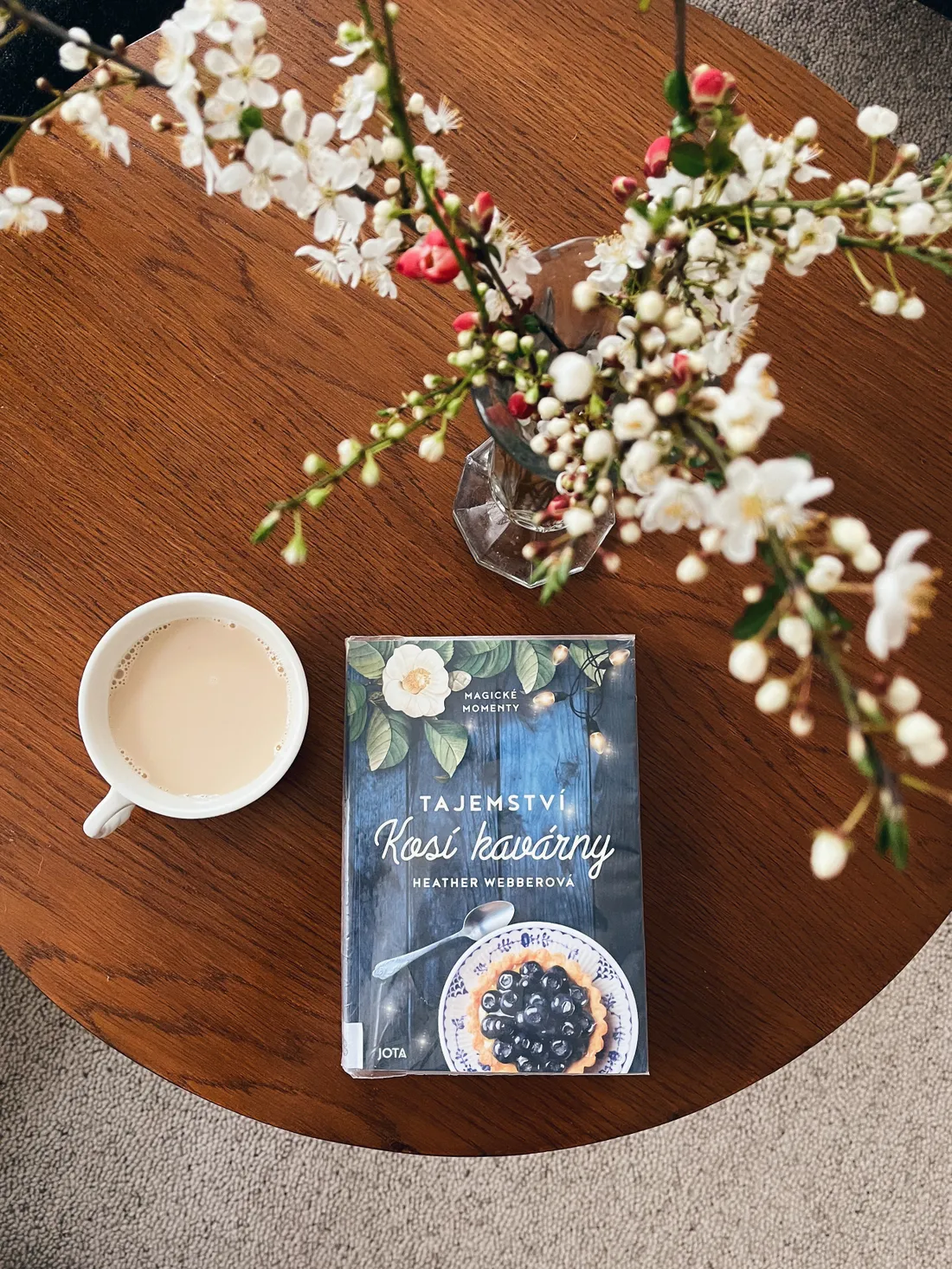 Po obědě chvíle na čtení s touto velmi odpočinkovou a čtivou knížkou z knihovny. K tomu ovesné chai latte a kvetoucí větvičky ve váze.