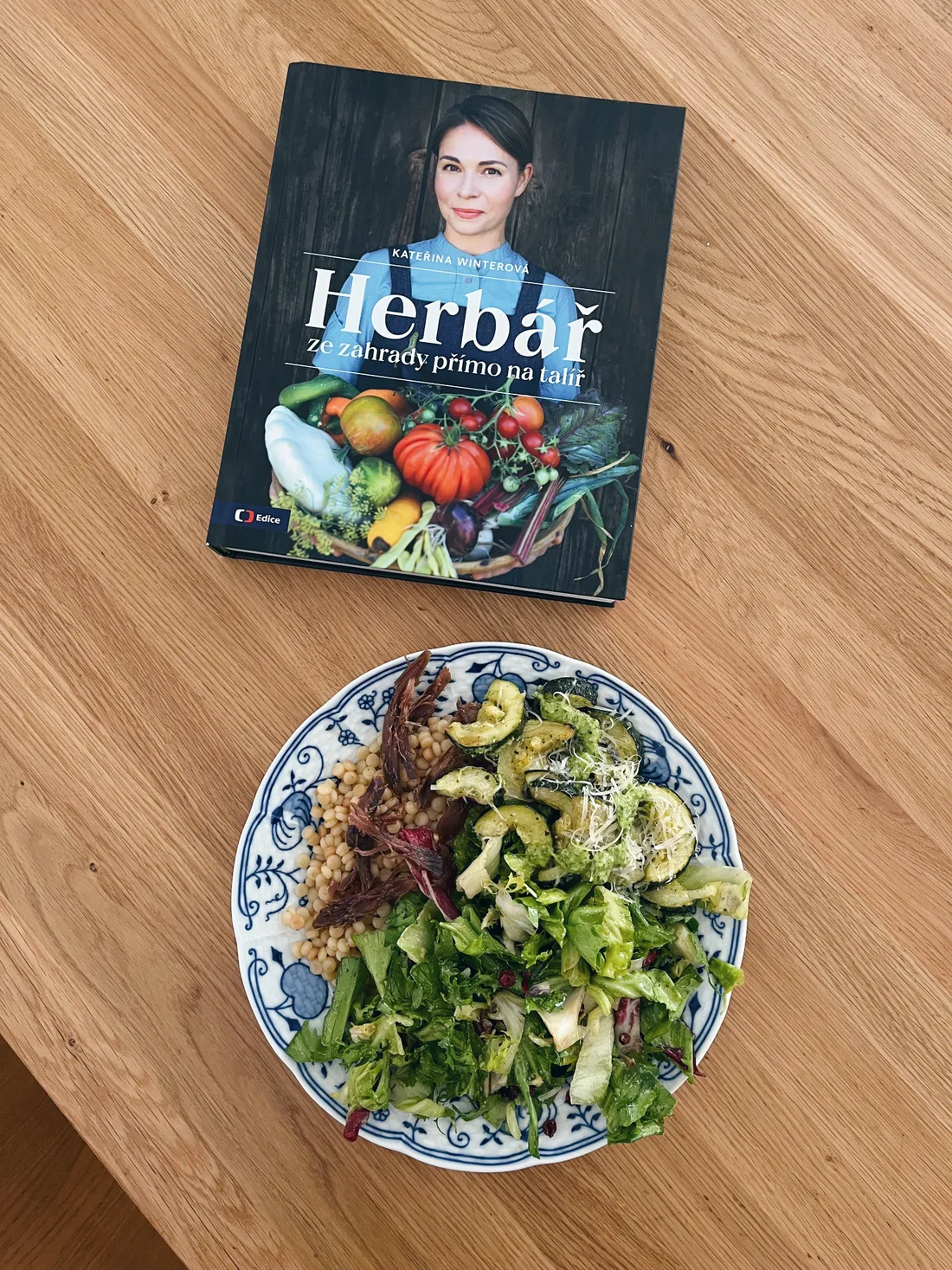 O obědu byl perlový kuskus vařený v kachním vývaru, opečená cuketa s parmazánem a citronem, salát a poslední zbytek kachního masa. A ke čtení Herbář, každé jaro se k němu vracím. Je plný rad o sázení, jsou v něm recepty, krásné fotky...moc povedená kniha.