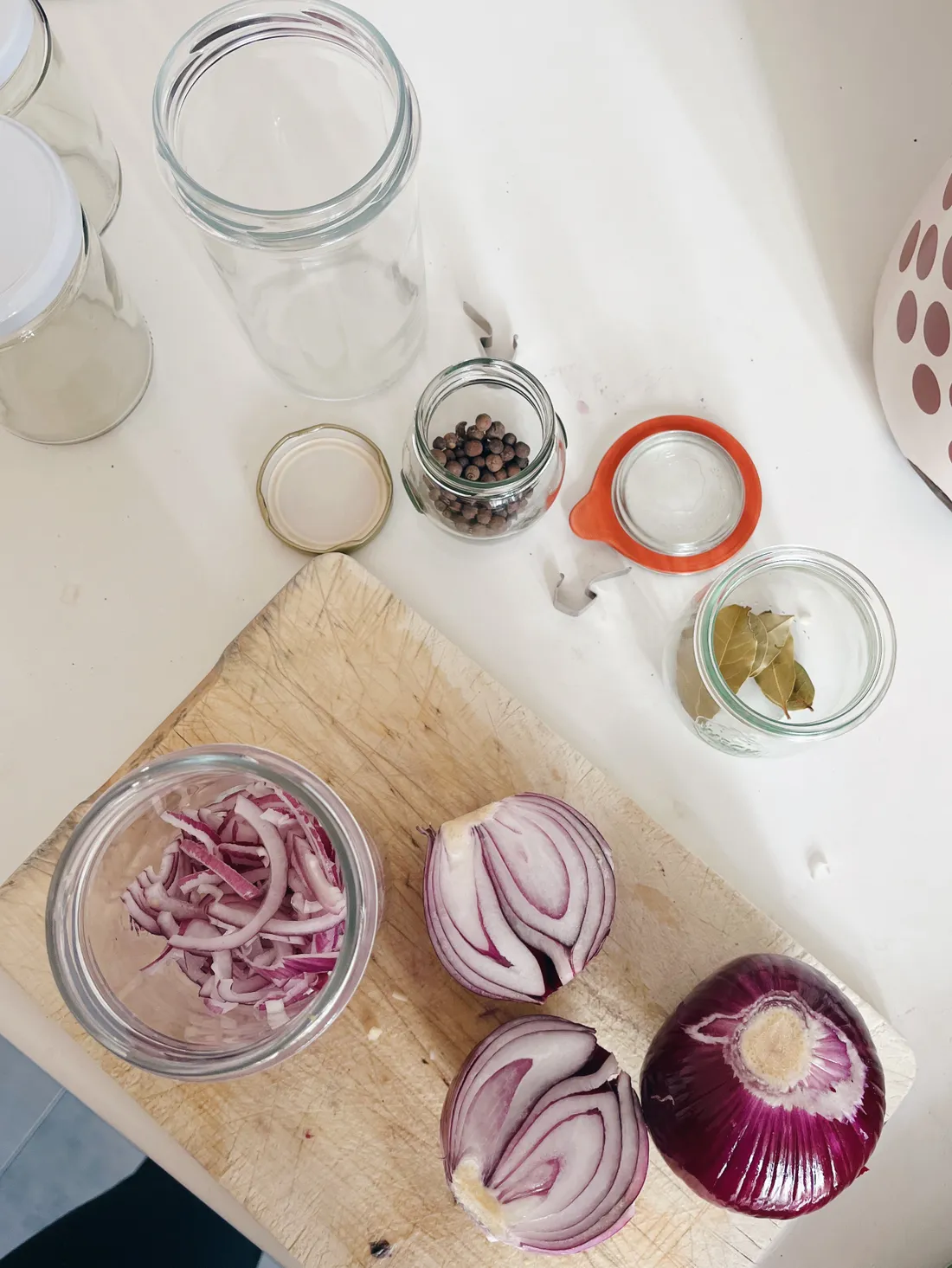 Doma jsem se pustila do nakládané červené cibule a okurek, takové rychlé pickles. Chcete recept?
