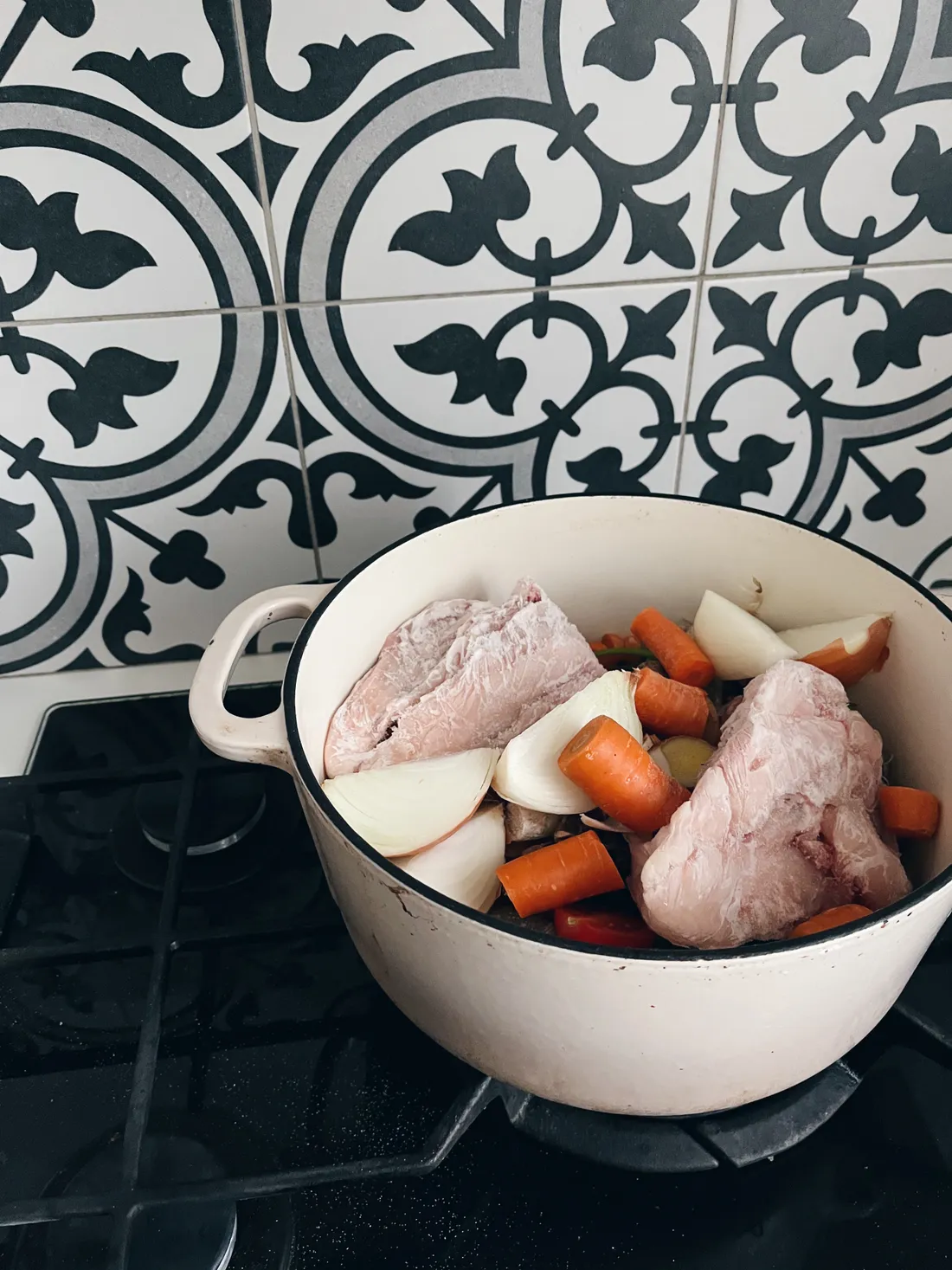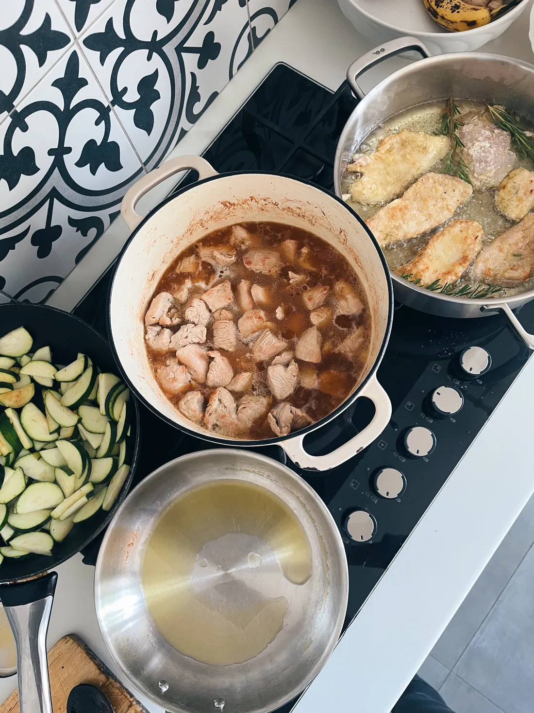 V neděli jsme na oběd pozvali manželovy rodiče. Tímto skládám poctu našemu plynovému sporáku, na které jsem naskládala obří hrnec, velikánskou nerezovou tegame pánev, dvě menší pánve a všechno se to vešlo.