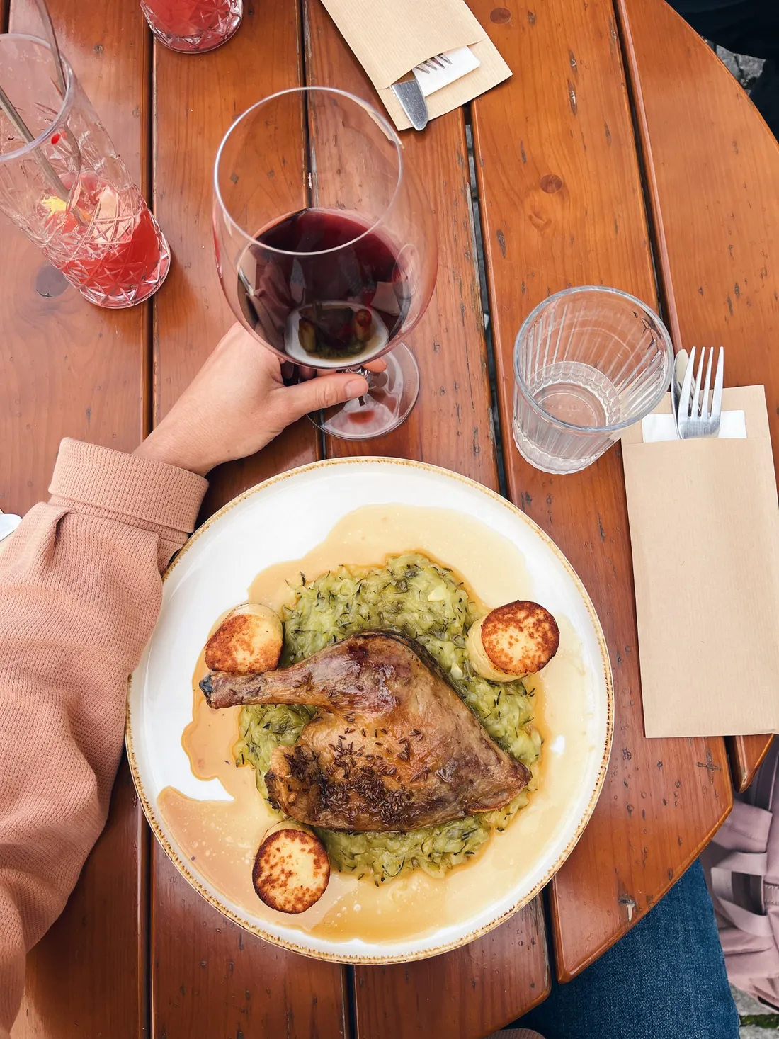 Dala jsem si kachnu s cuketovým zelím a krupicovými knedlíčky. A k tomu deci červeného. Velmi dobré.