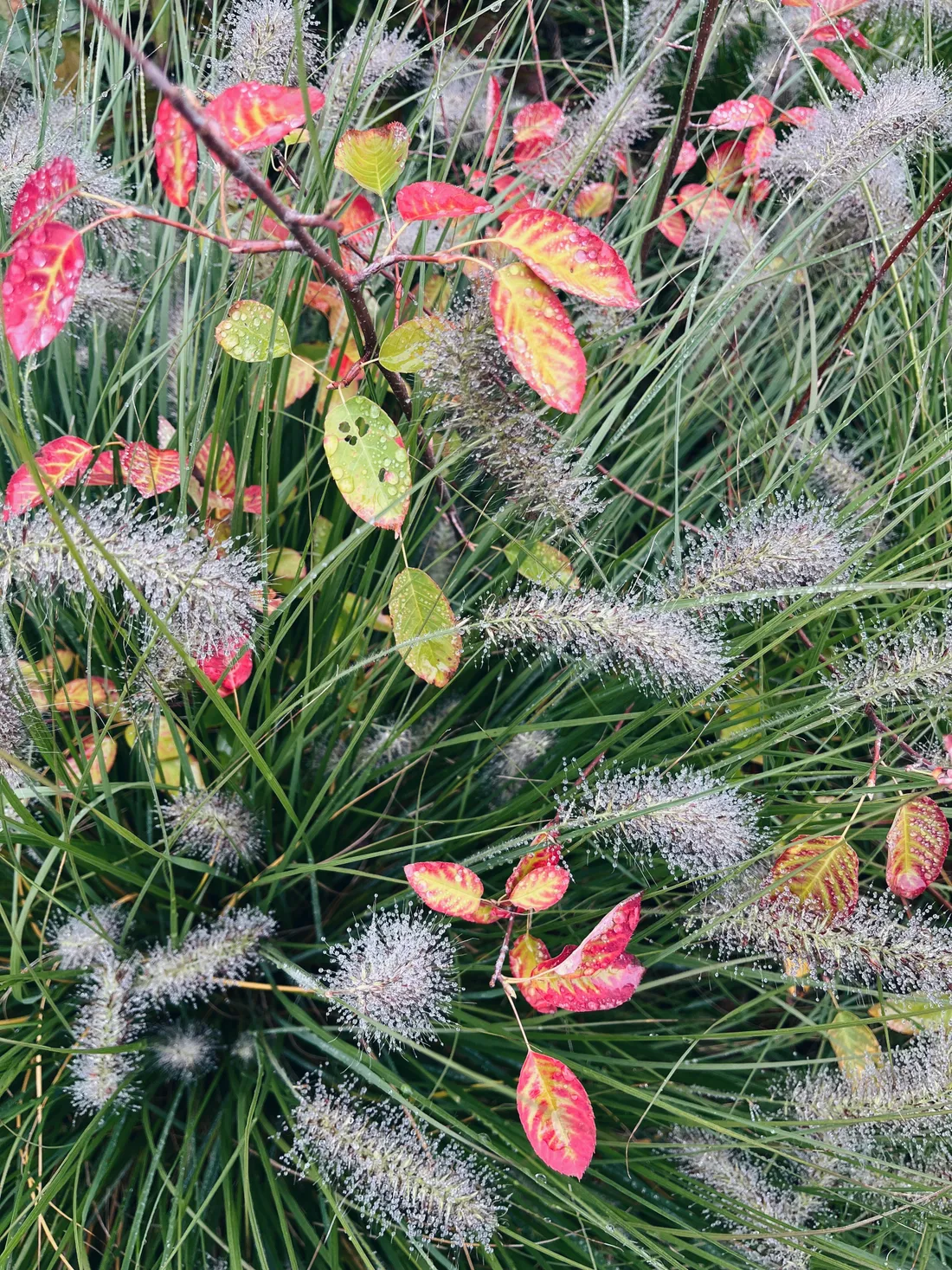 A traviny jemně obalené kapičkami deště, velmi podzimní.