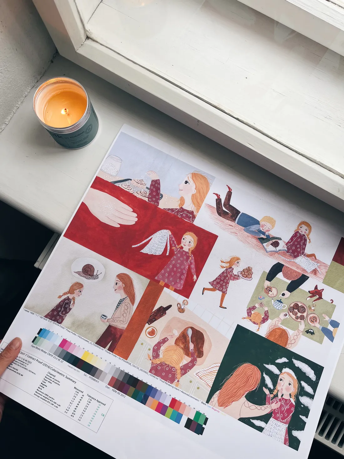 Z tiskárny dorazily nátisky do knihy Elsa a skořicoví šneci. Než se totiž ilustrace dostane do knihy, musí ujít kus cesty. Každou ilustraci naskenuju, vyretušuju a barevně upravím, aby se barvy dobře vyjímaly v hotové knížce. Nátisky jsou takový náhled, podle kterého kontroluju, že jsem barvy dobře upravila na tisk na vybraný papír.