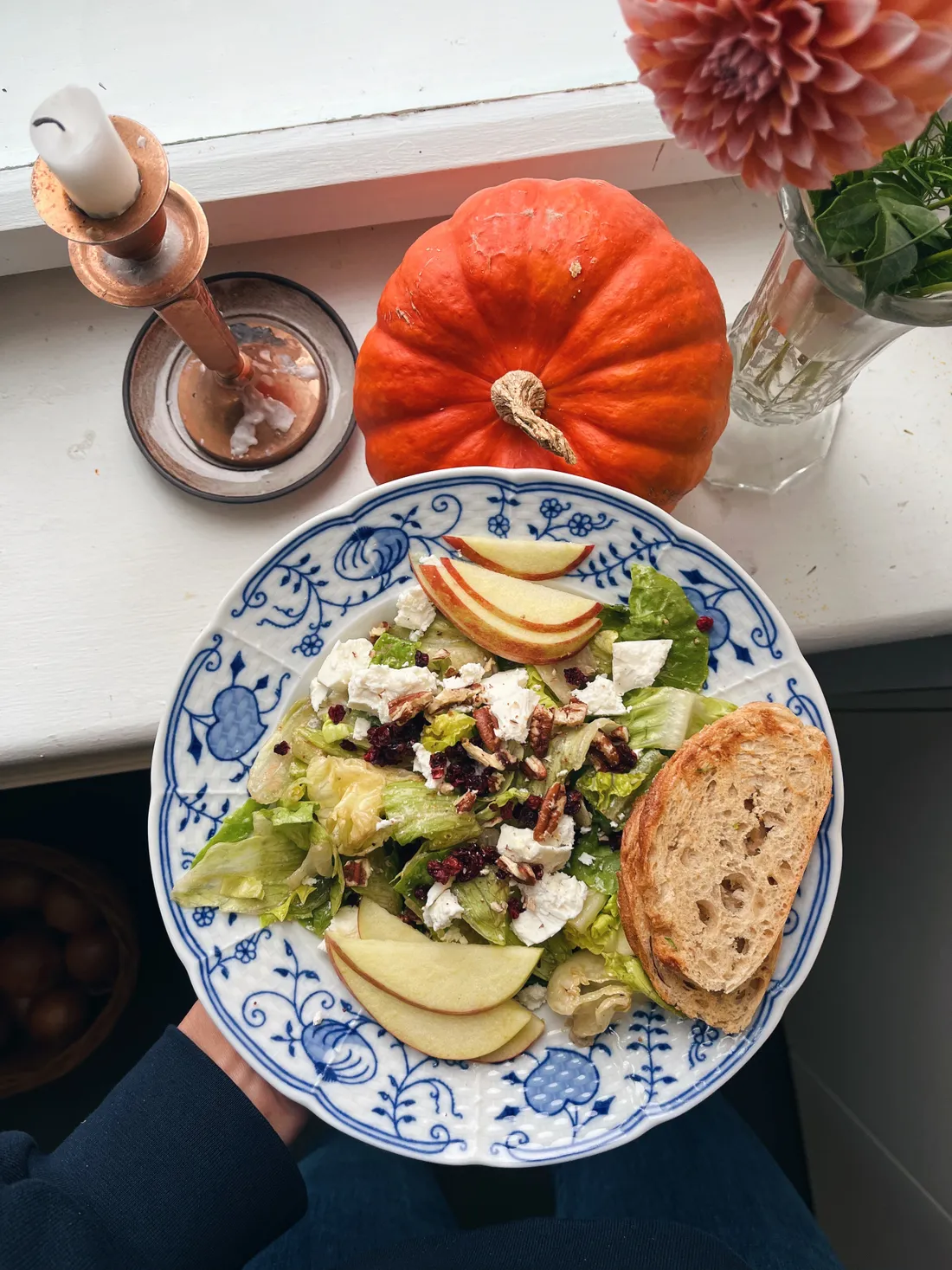 Moje oblíbená podzimní salátová kombinace jsou pekany, brusinky, feta a křupavé plátky jablek. A jako základ salát se zálivkou. Zkuste to taky a uvidíte, že je to dobrota.