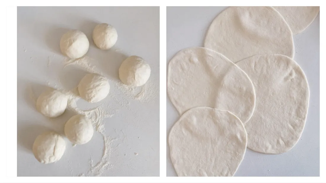 - Z každého kousku vyválejte kuličku. Pořádně podsypejte moukou a válečkem rozválejte na placku.