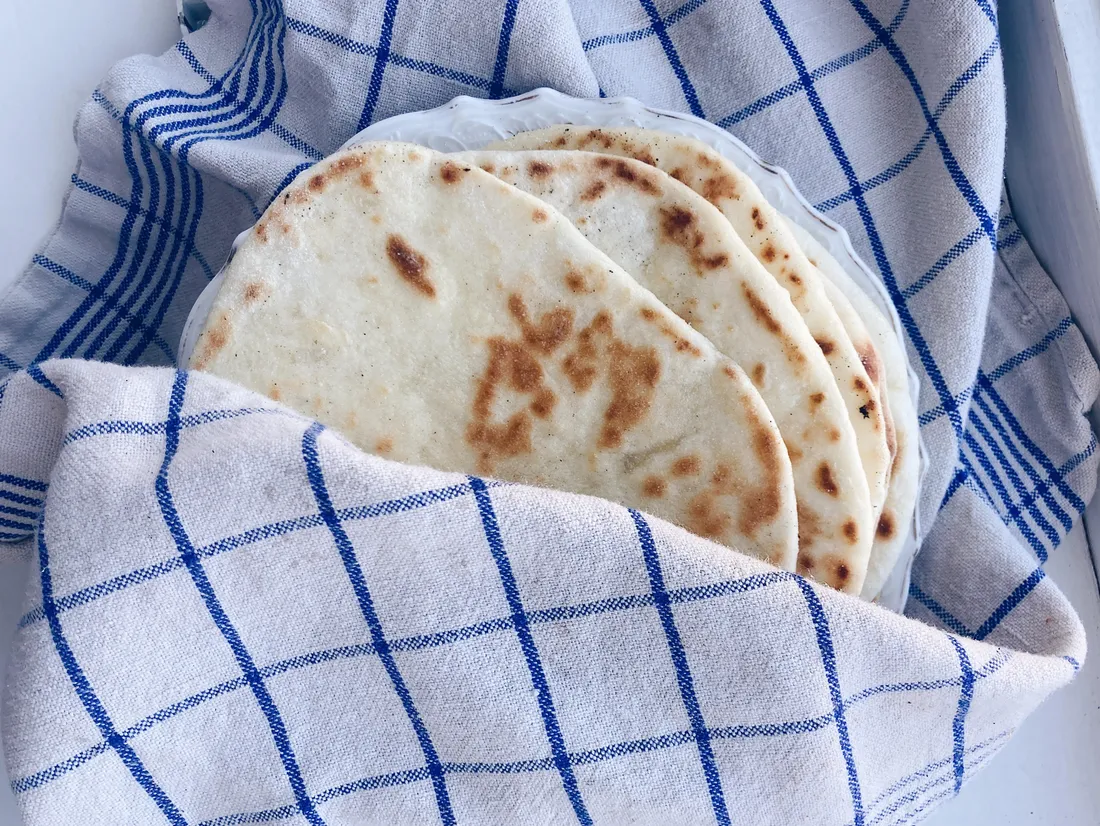 Těsto na placky by mělo být trochu lepkavé, což pomůže tomu, že zůstanou vláčné. Nebojte se těsto při vyvalování pořádně posypat moukou.