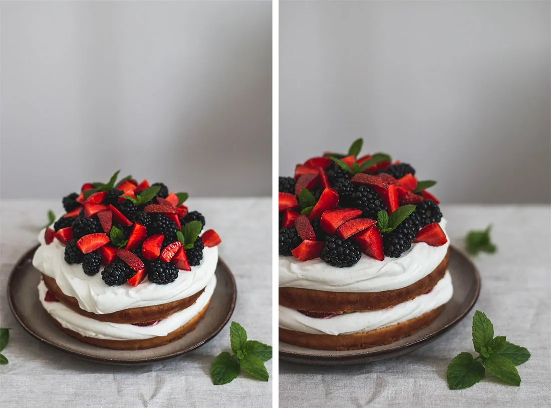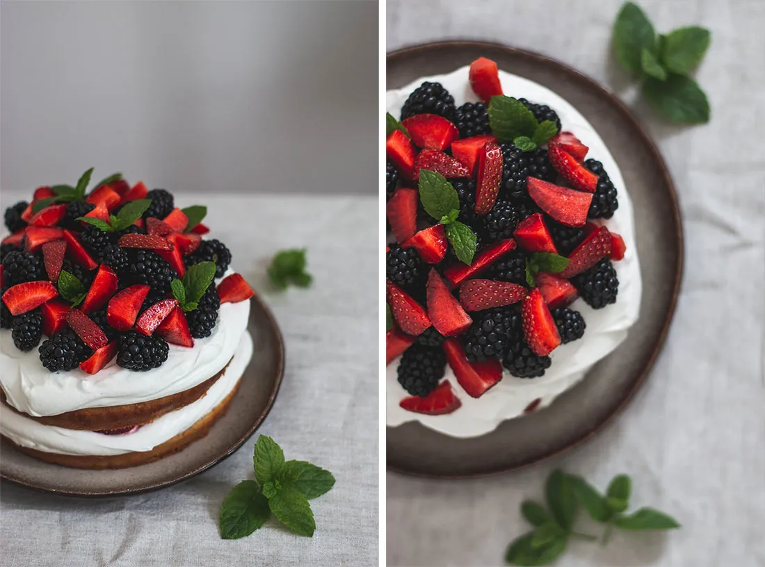 - Potřete zbývajícím krémem, ozdobte ostružinami, kousky jahod a mátou.