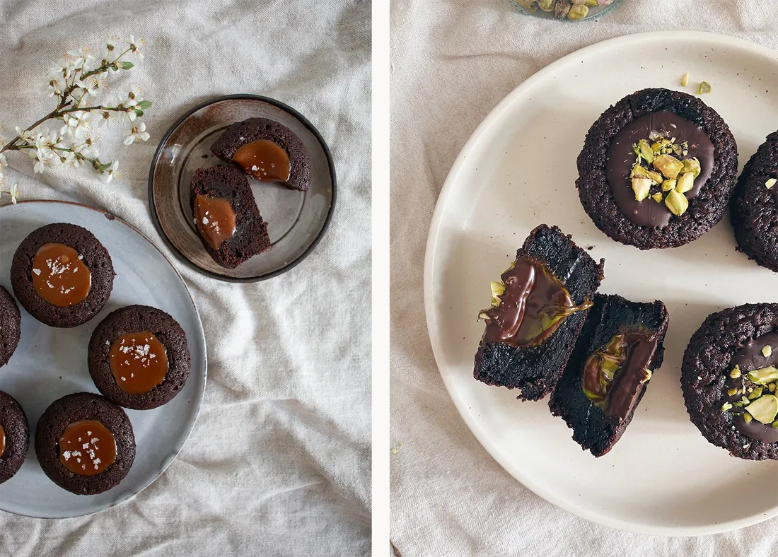 Kladdkaka nemusí být jen koláč, pekla jsem ji i jako muffiny naplněné slaným karamelem a jako bezlepkové muffiny s pistáciovým máslem. Obojí je dokonalost!