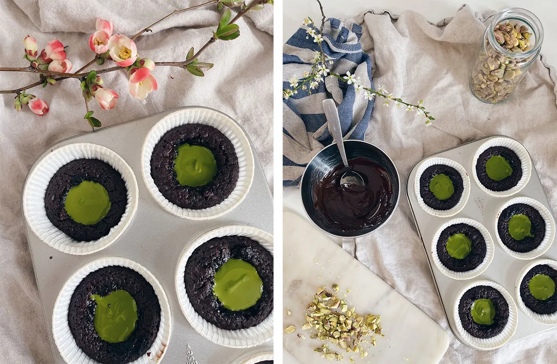 - Důlky v muffinech naplňte pistáciovým máslem a nechejte 2 hodiny chladit v lednici nebo hodinu v mrazáku.