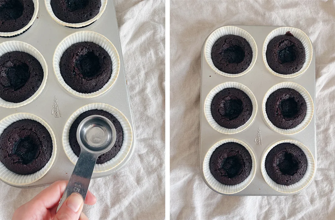 - Muffiny vytáhněte z trouby a nechejte asi půl hodiny chladnout. Pak ho jejich středu pořádný udělejte důlek – třeba lžící nebo malou skleničkou.