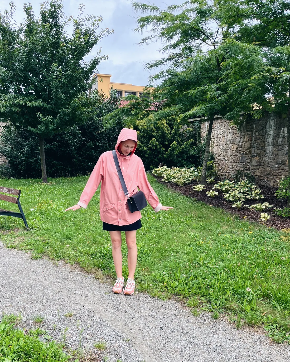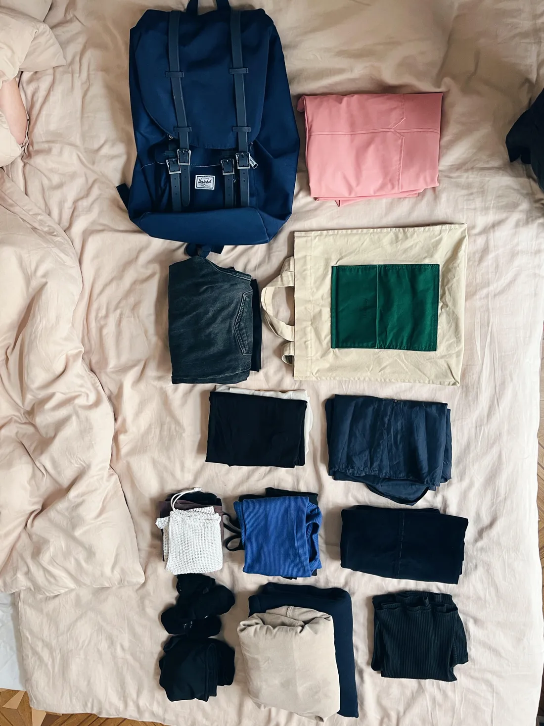 Jela jsem jen s malým batohem, a tak jsem se balila docela úsporně. Tak, aby všechny kousky navzájem ladily a daly se dobře vrstvit. Předpověď hlásila víceméně stejné počasí jako tady, kolem 20 stupňů, jen víc deště.