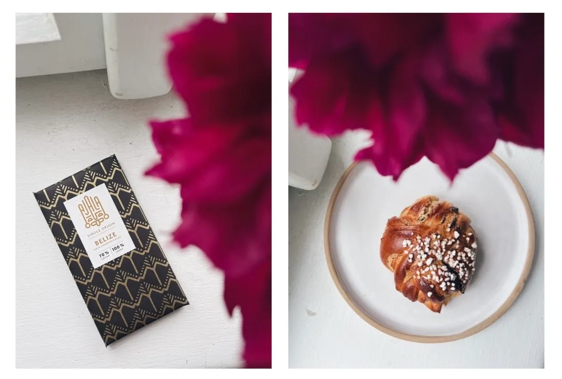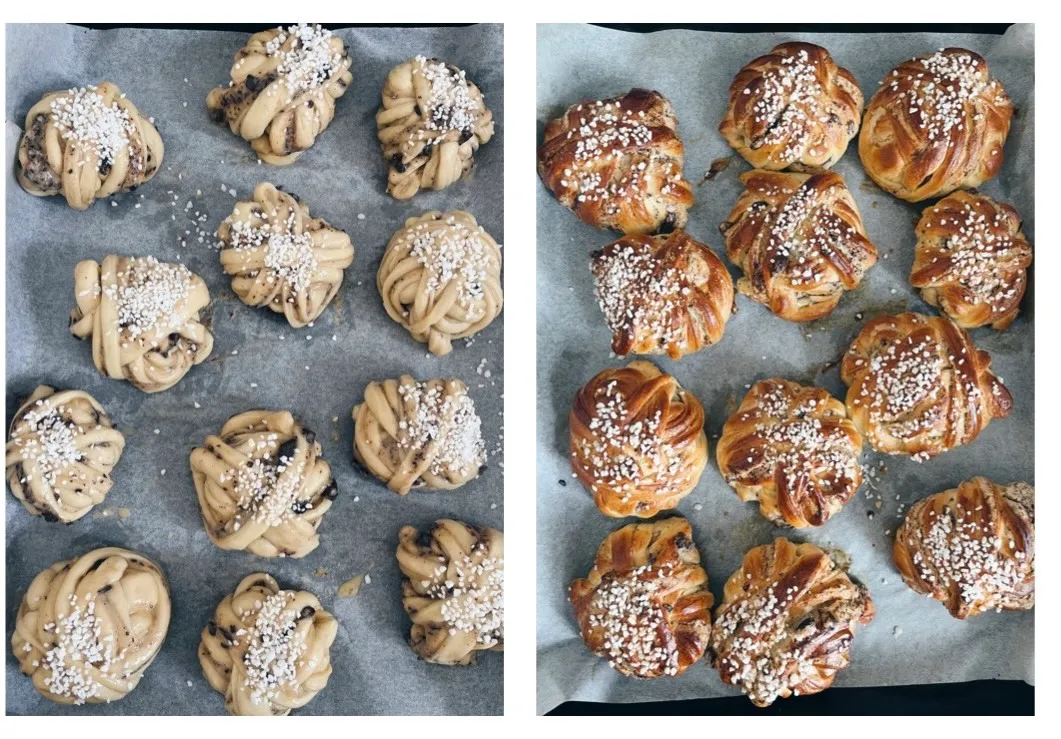 Kynuté motance jsou plněné tahini, zemitou pastou ze sezamových semínek, a vysokoprocentní čokoládou. A díky perlovému cukru jsou úplně jako z některé severské kavárny.