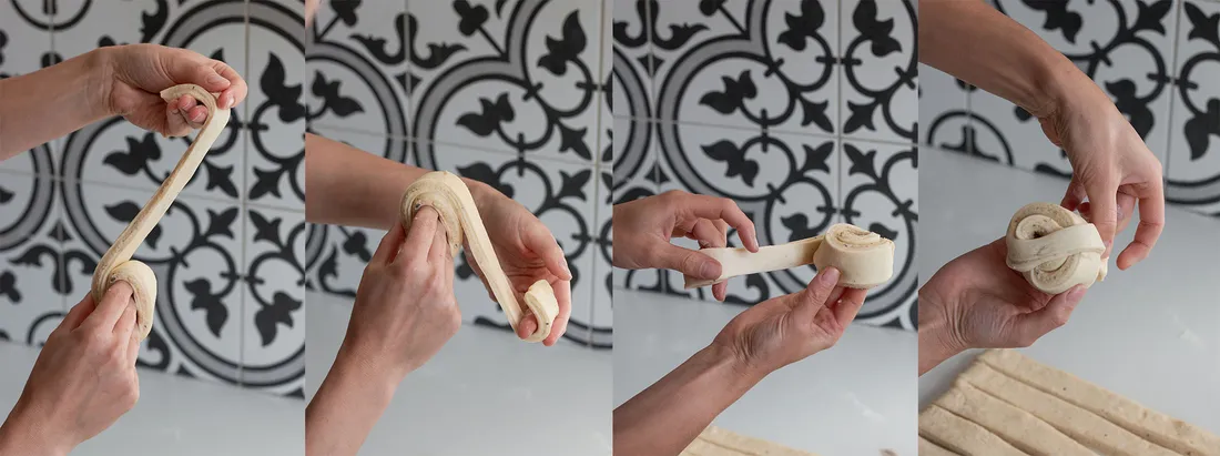 - Jak těsto zamotat? Pásek nejdříve natáhněte, nejlépe to půjde, když jím jemně zatřesete. Jeden konec těsta uchopte mezi palec a prostředníček. Pásek přibližně dvakrát omotejte kolem všech prstů. Konec pásku veďte přes šneka a schovejte ho pod těsto. Odložte na plech.