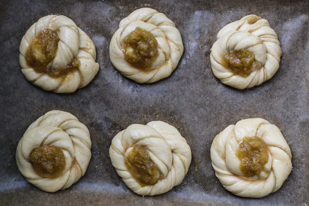 - Uzlíky skládejte na dva plechy vyložené pečicím papírem, zakryjte utěrkou a nechejte další půlhodinu kynout.