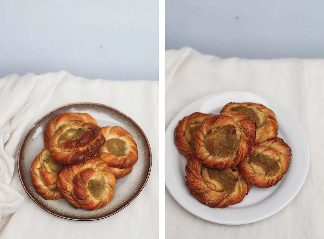 Šnečci z kvasnic byli nadýchaní a chutnali… no, jako kynuté těsto. Kváskoví šneci vyžadovali delší dobu pečení a tím pádem byli o něco sušší (to je způsobeno i nižším obsahem másla v těstě). Taky byli menší, a i když bylo v obou receptech stejné množství cukru, kváskoví byli pocitovš míň sladcí (v receptu na šneky z kvasu proto uvádím víc cukru). A jak ti kvasoví chutnali? Úplně jinak než z kvasnic a lehce mi připomínali chleba nebo rohlíky.