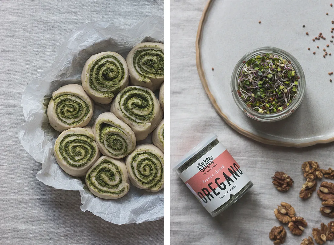 V tomto receptu používám vlašské ořechy jako základ pro pesto, voňavé a krásně aromatické lyofilizované oregano, křupavá solená dýňová semínka a naklíčená semínka ředkvičky.