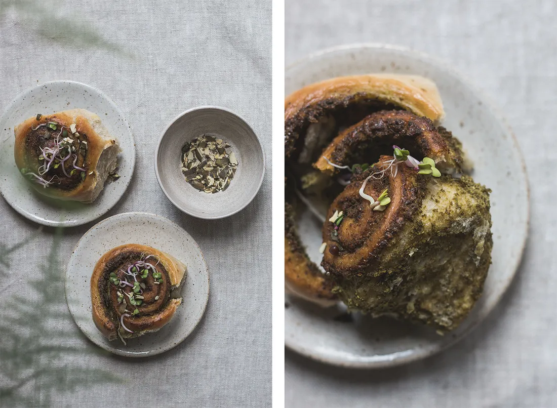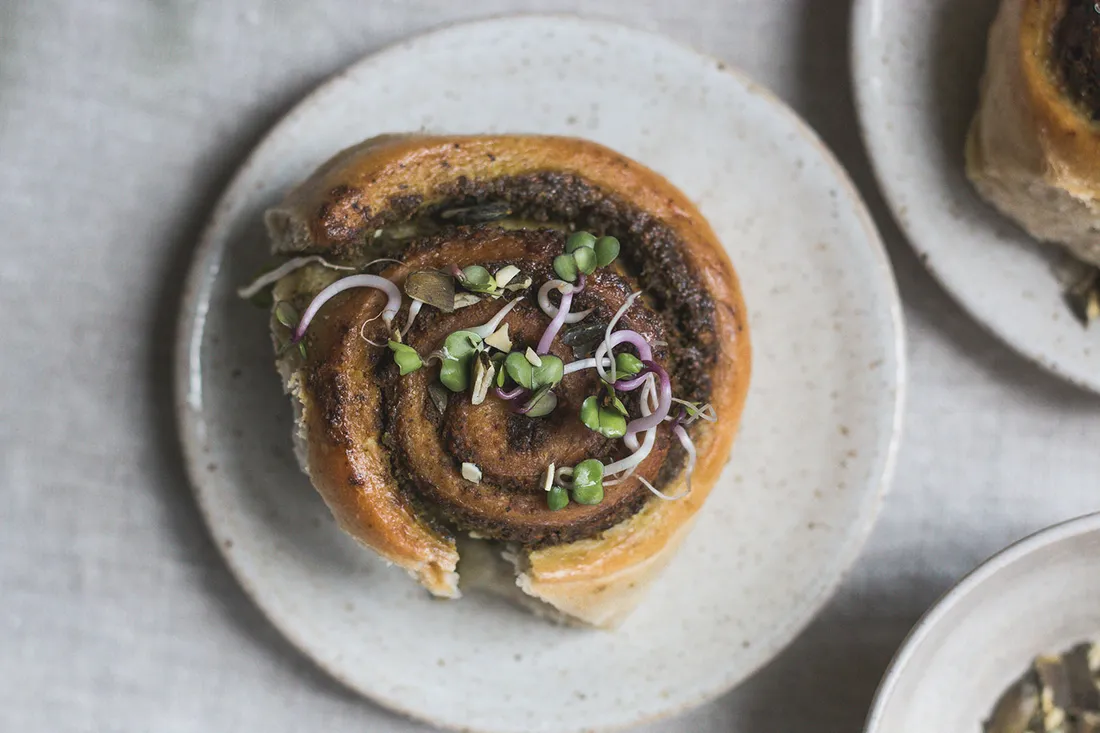 - Hotový šnečí koláč nechejte vychladnout a před servírováním posypejte sekanými dýňovými semínky a naklíčenou ředkvičkou.
