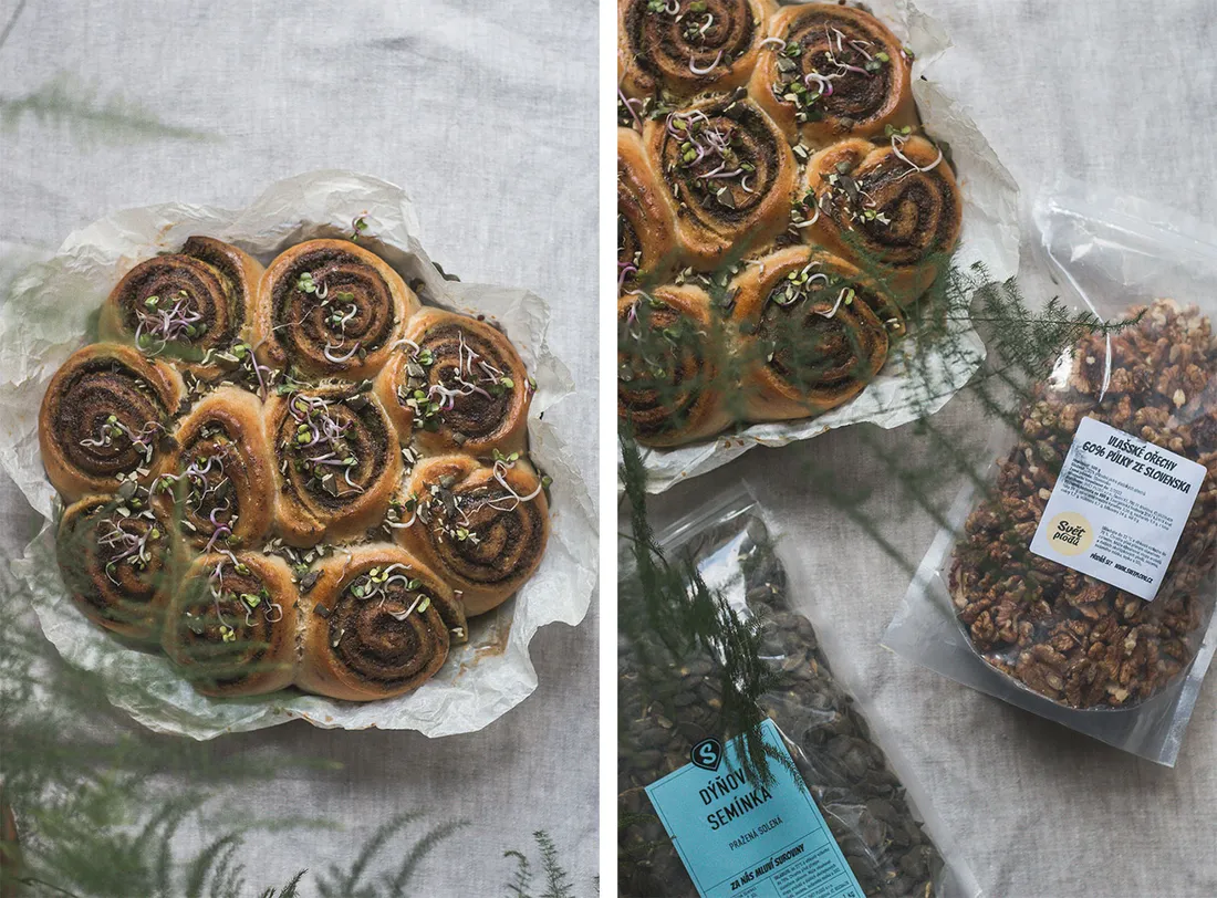 - Hotové šneky jsem posypala praženými dýňovými semínky, aby to pěkně křupalo, a naklíčenými semínky ředkvičky. Ředkvičky potřebují asi 4-5 dnů, aby stihly naklíčit, tak na to myslete. Klíčky si dávám také k obědu místo salátu, na chleba s pomazánkou a taky je můžete přidat do smoothie a rozmixovat. Jsou moc zdravé a mají příjemně štiplavou chuť.