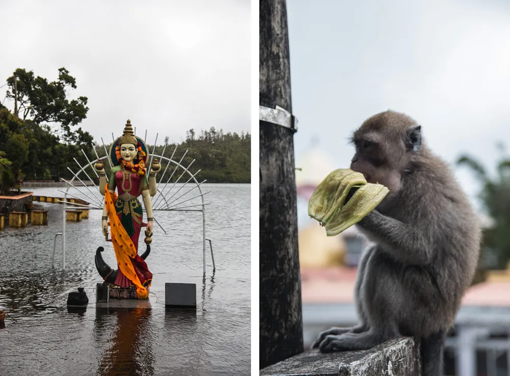 Jeden den jsme přejížděli hory a najednou se před námi vynořily třicetimetrové sochy hinduistických božstev a nejposvátnější místo ostrova uctívané hinduisty - Grand Bassin. Jezero, které tu leží, vzniklo ze sopečného kráteru a kolem něj jsou postaveny sochy božstev. Místní obyvatelé u jezera vykonávají oběti (které si pak často uloupí opice nebo houfy koček).