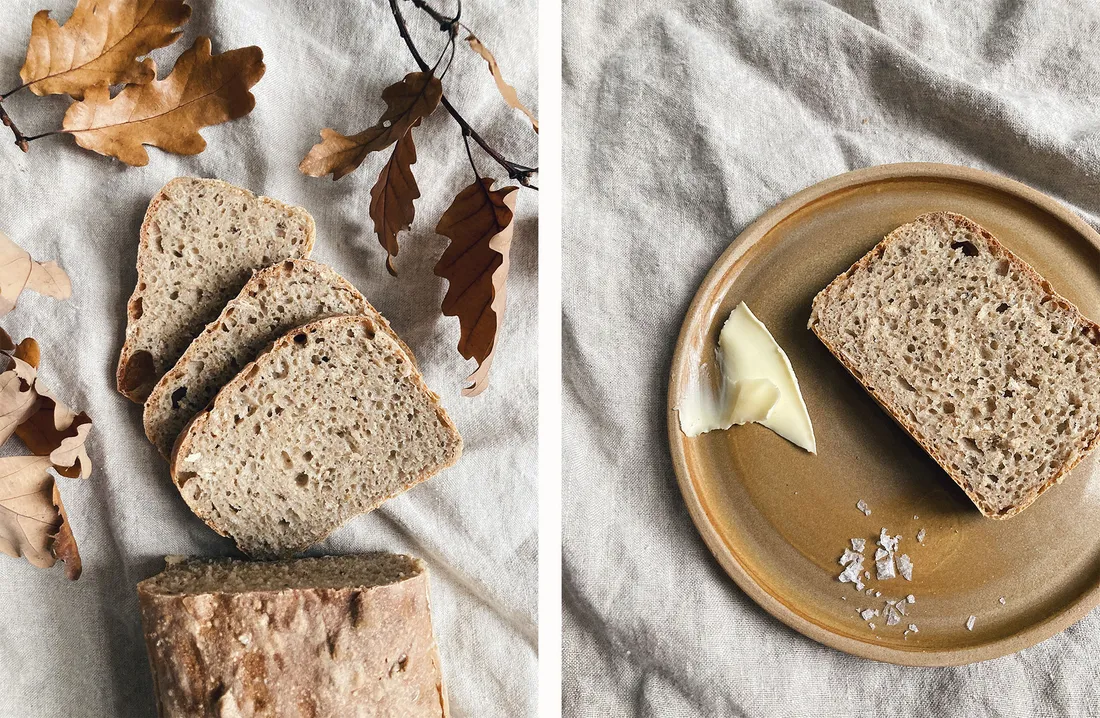 Pečení chleba je pro mě takový malý rituál, který patří mým všedním dnům. U okna mi stojí sklenice s kváskem, který denně krmím. Chleba peču víceméně od oka, kombinuji různé druhy mouky, semínek, někdy i sušeného ovoce a nejčastěji ho peču v podlouhlé formě. Je to pořád tentýž recept, ale pokaždé vlastně trochu jiný. A všem nám moc chutná.