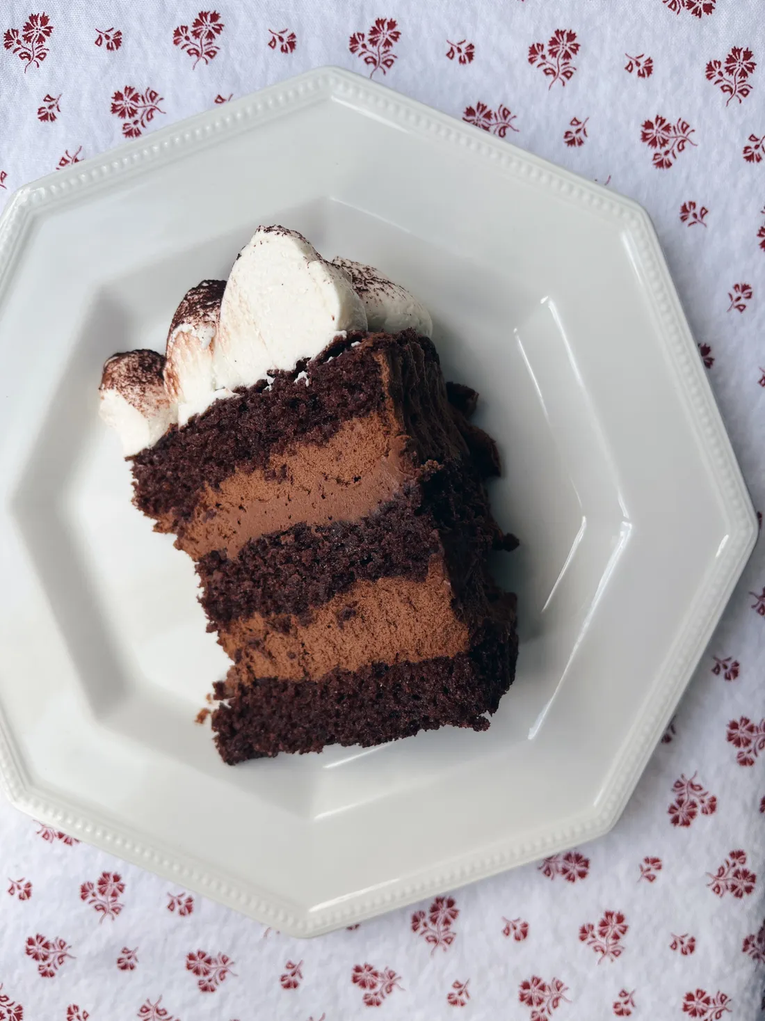 A tady je dort, každý snědl skoro dva kousky. Je to čokoládový s čokoládovou pěnou a kávovou šlehačkou z mojí kuchařky Dorty, ale kávu jsem z receptu vynechala. Takový čokoládový obláček!
