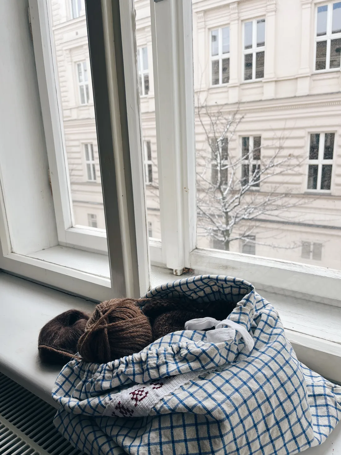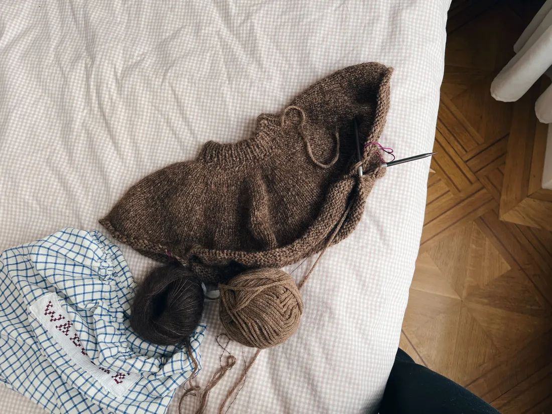 Ve volných chvílích beru do ruky pletení a pracuju na hnědém svetru. Světlejší klubko je Alpaca 3 (vlna s alpakou) a tmavší je Tynn Silk Mohair (směs mohéru, hedvábí a vlny).
